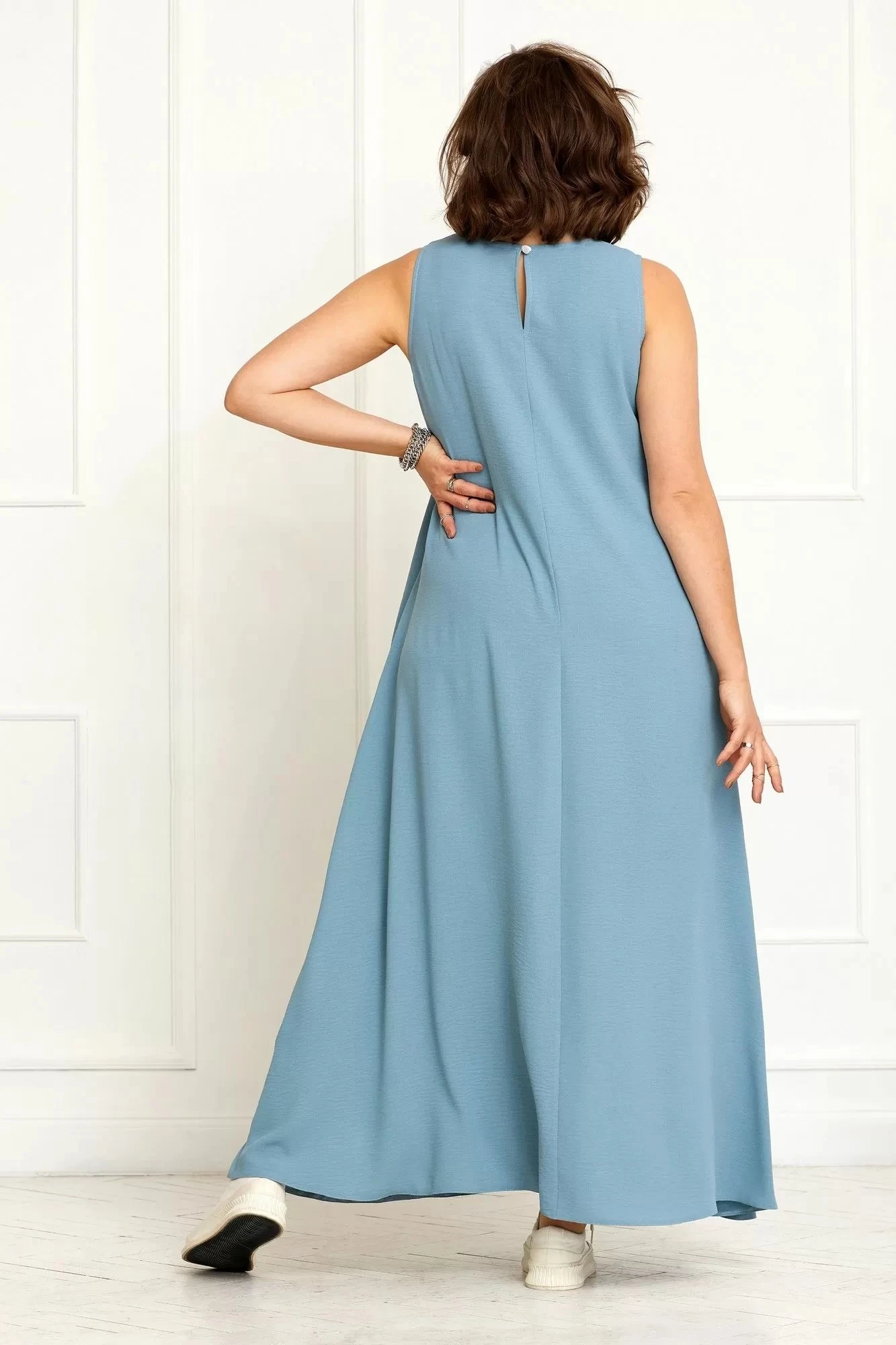 Летнее платье, А-силуэта, без подкладки. Выполнено из приятной, растяжимой, немнущейся ткани с эффектом жатки. Отлично подходит для обладательниц нижнего типа фигуры. Длина макси.