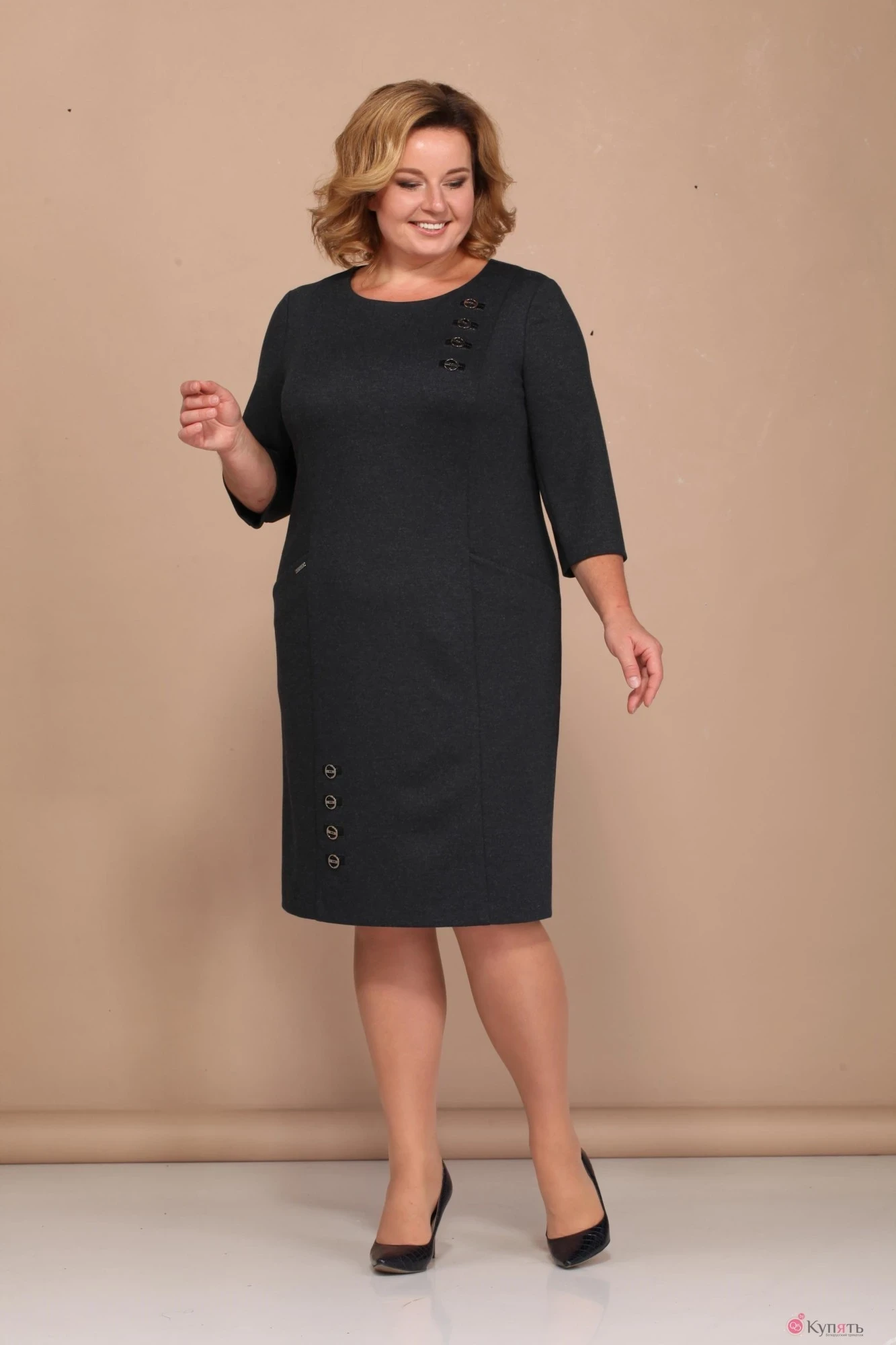 Элегантное женское платье полуприлегающего силуэта из трикотажного полотна. По переду платье украшено обтачными петлями из отделочной ткани и пуговицами. На уровне бедер обработаны карманы. Горловина круглая. Спинка с центральным швом с застежкой на молнию. Рукава втачные двухшовные.