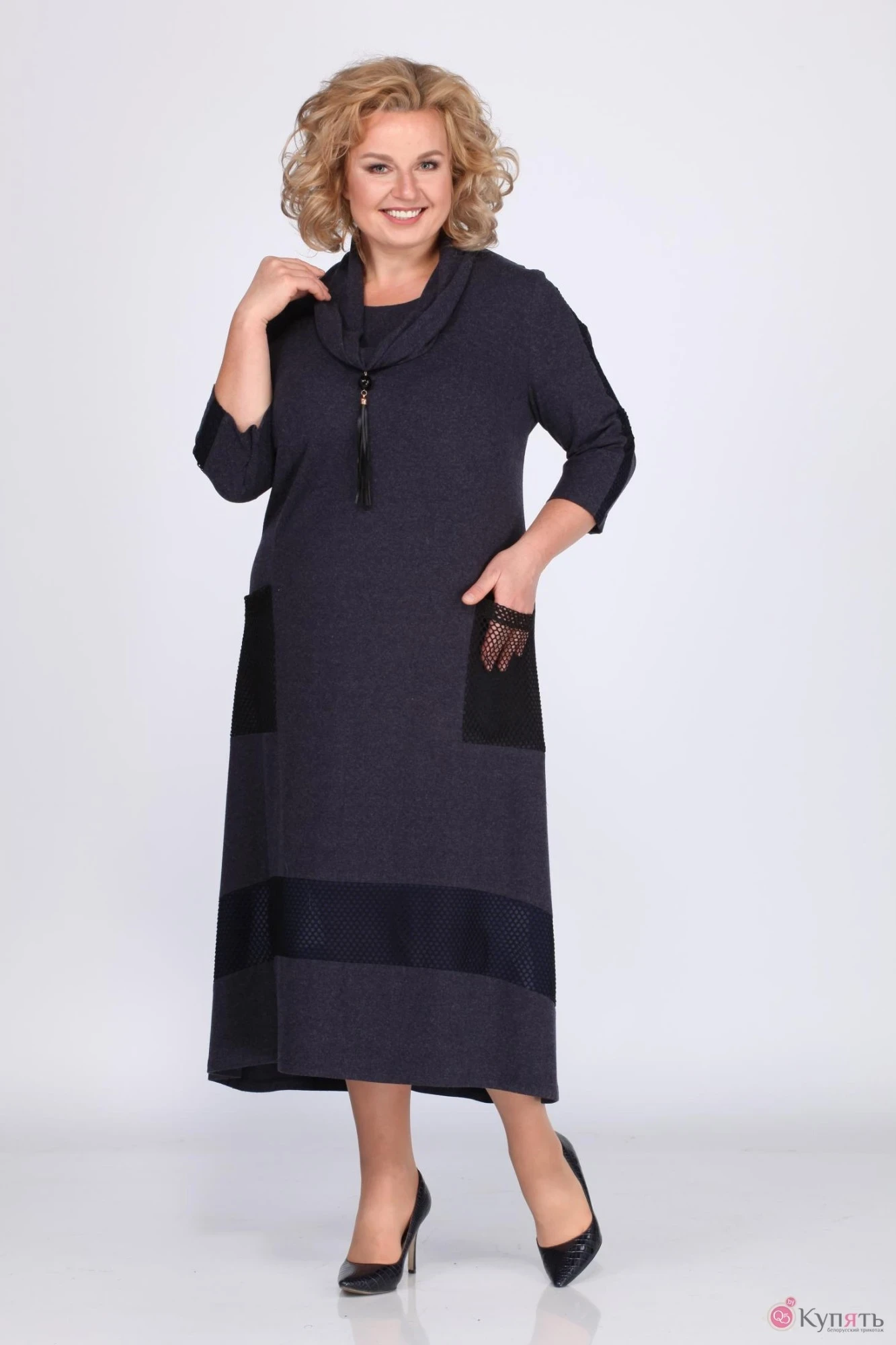 Женское платье выполнено из комфортного трикотажного полотна, свободного силуэта, расширенное к низу. По переду на уровне бедер накладные карманы из сетки, горловина круглая оформлена воротником «хомут», который втачен по спинке и отлетной по переду, по центру переда хомут задрапирован декоративной подвеской. По низу платья, по переду и спинке втачная деталь из сетки, низ платья ассиметричный – спинка длиннее переда. Рукава втачные одношовные, по центру рукава вставка из сетки.