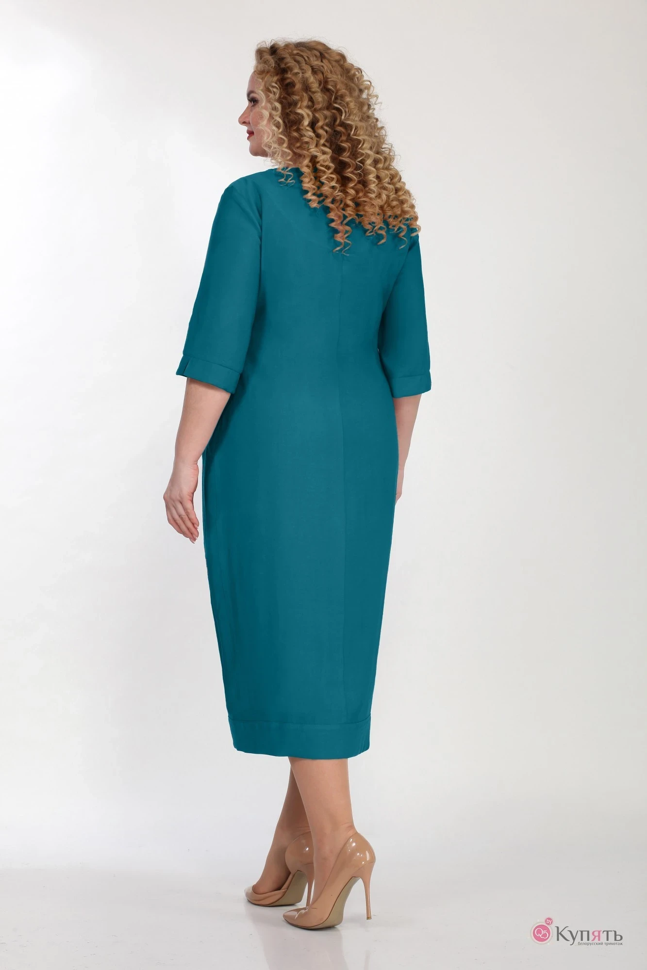 Стильное женское платье полуприлегающего силуэта. По переду платье с центральным швом. Горловина «V» образная, по шву пришивные декоративные элементы. На уровне бедер в боковых швах карманы. Рукава втачные, длина ¾, по низу притачной манжет с разрезом по центру. Низ платья со складками и притачной планкой. В центральном шве переда по низу разрез. Фурнитура на платье может меняться.!!!