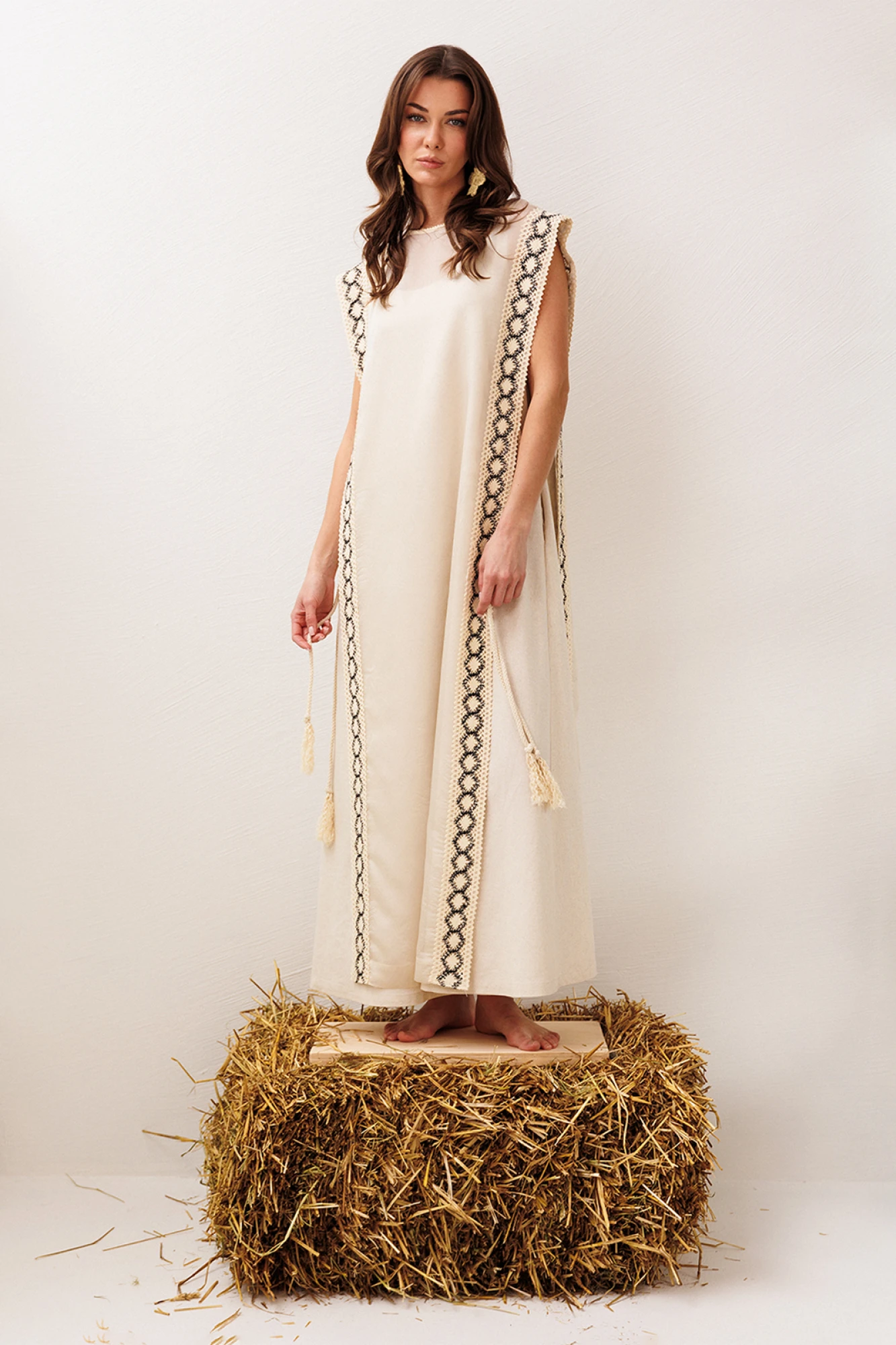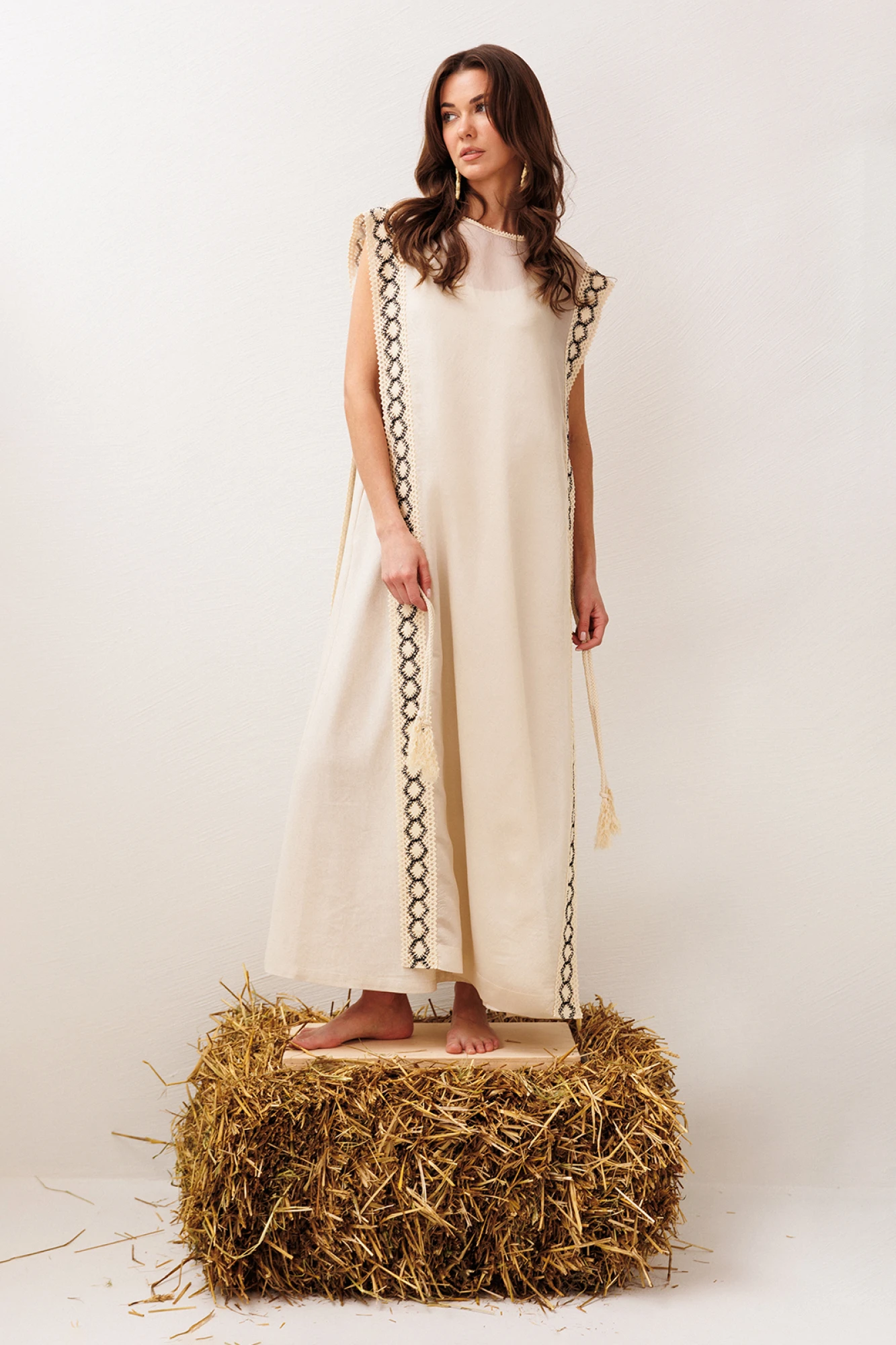 Платье длинное, состоящие их верхнего и нижнего. Верхнее платье из полупрозрачной ткани, слегка расклешенное к низу без рукавов. По бокам платье не стачено с завязкой на декоративный шнурок. По всей длине полочки и спинки по бокам настрочено кружево. Горловина округлая с притаченым к ней кружевом. По спинке вырез капля с застежкой на навесную петлю-пуговицу. Нижнее платье А-силуэта без рукавов, с карманами в боковых швах. Вырез горловины – округлый.