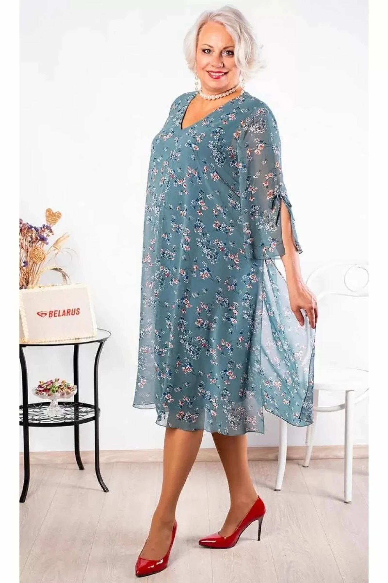 Восхитительное нарядное платье для женщин большого размера. Нижнее платье полуприлегающего силуэта выполнено из трикотажа, верхнее – силуэта трапеция из шифона.