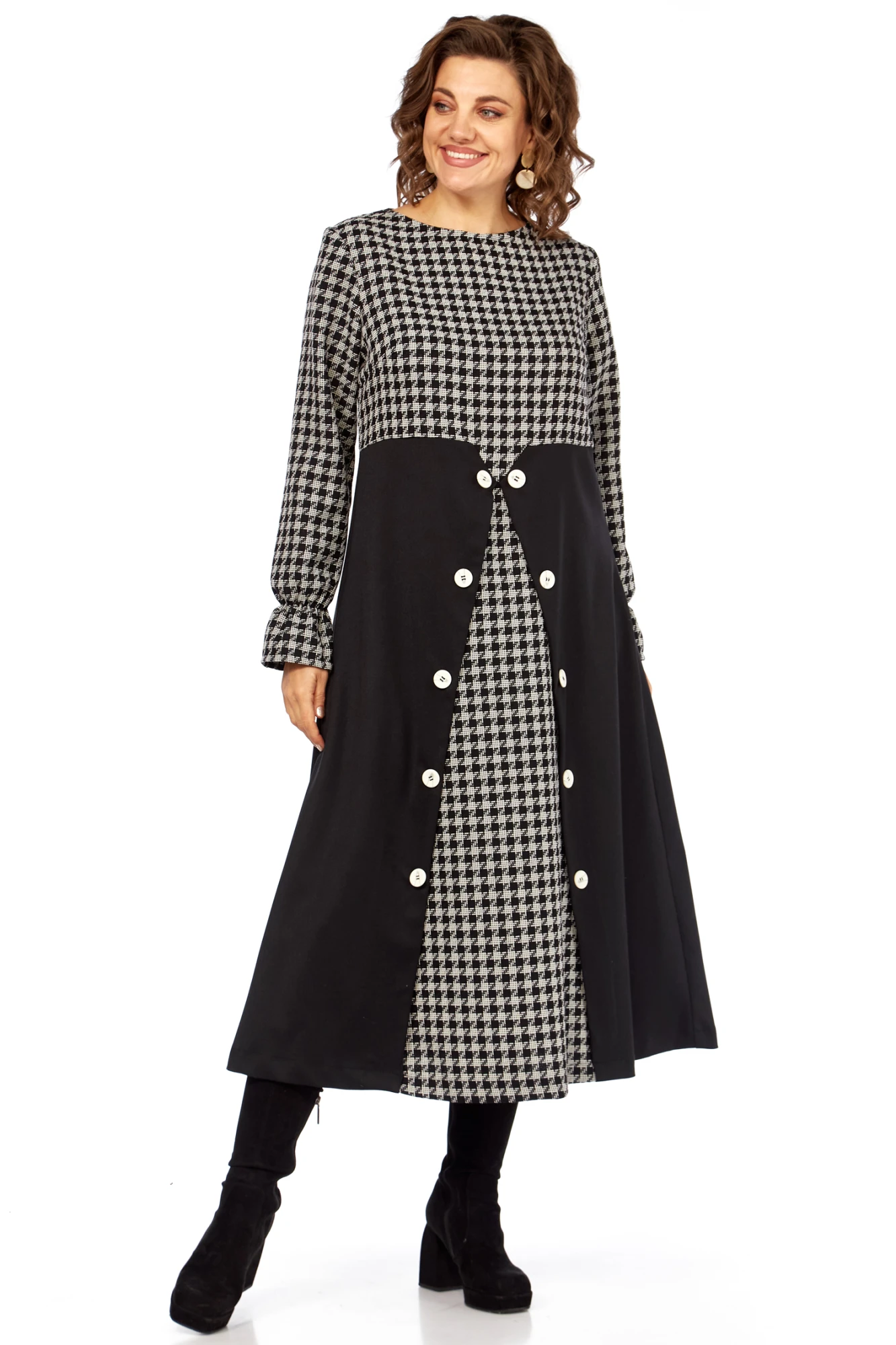 Вечная классика, которая всегда в моде, в платье «Шарм Одри». Платье имитирует сочетание стильного топа с принтом «гусиная лапка» и элегантной юбки-пальто. Это создает эффект многослойности и делает образ более глубоким и интересным, при этом являясь единым цельным нарядом.