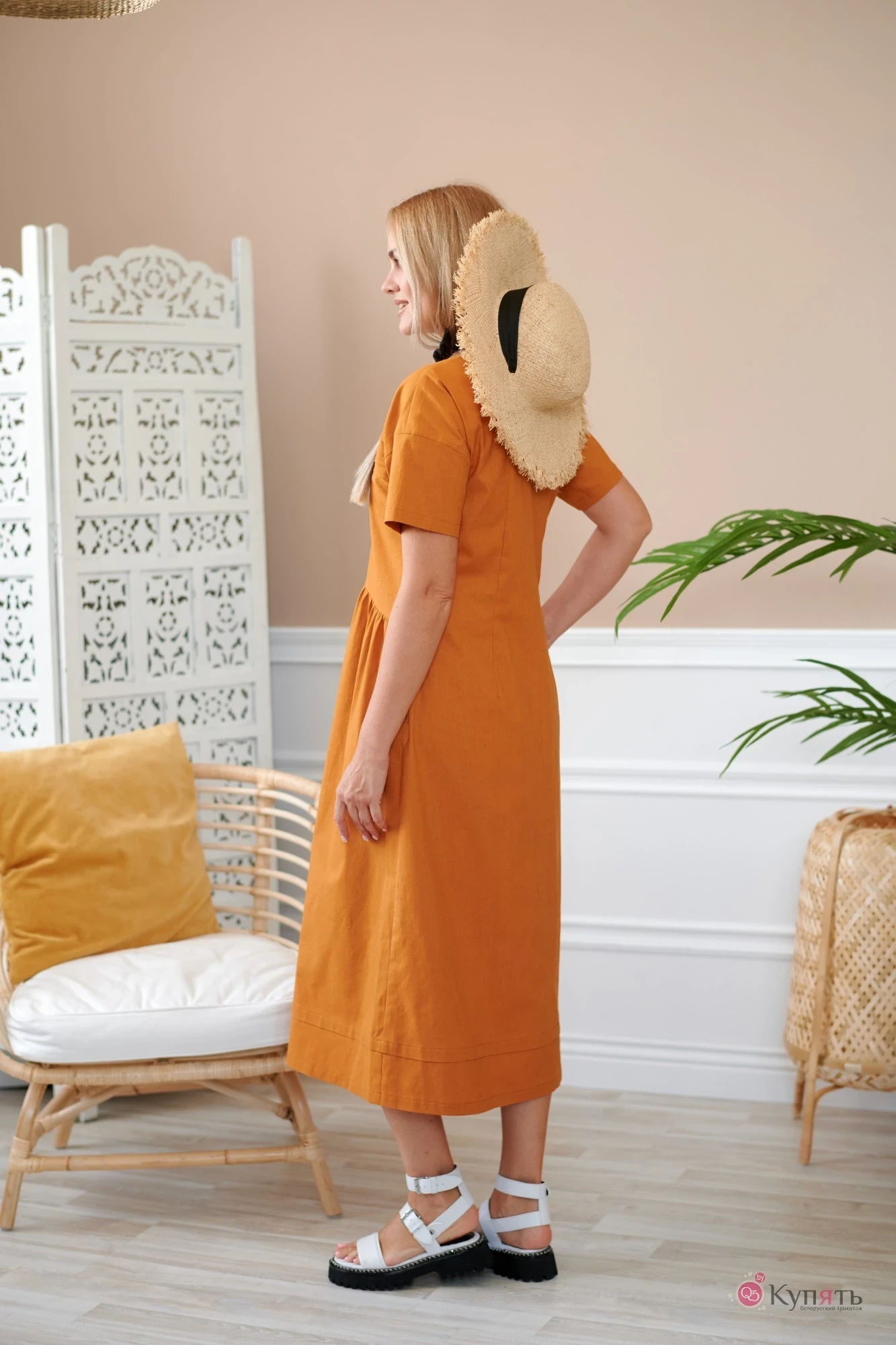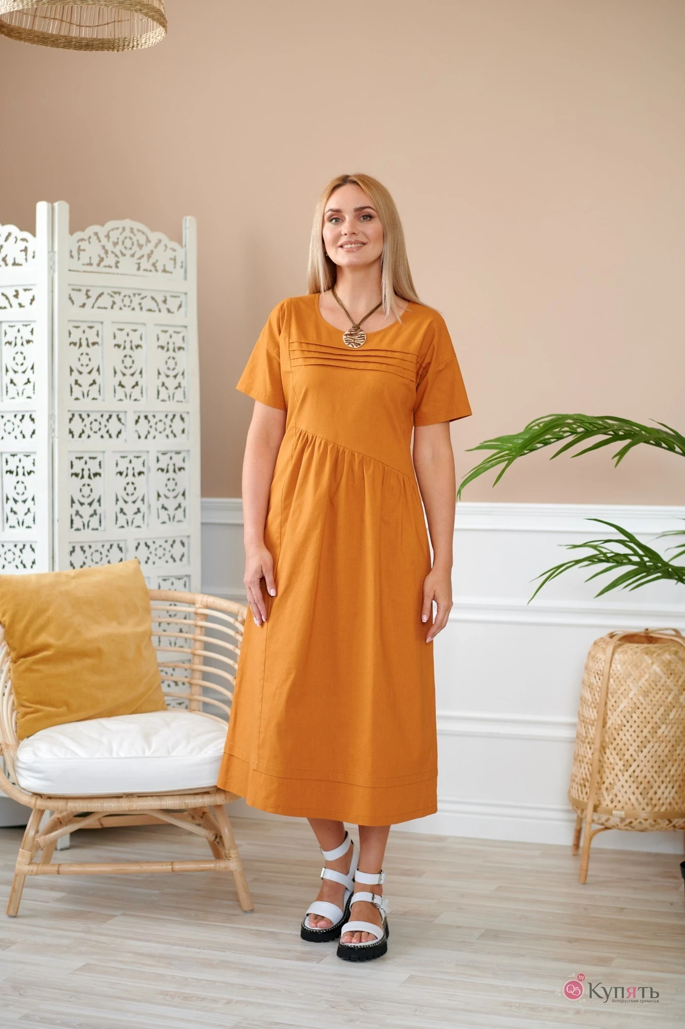 Эффектное платье А-образного силуэта из ткани под лён с содержанием эластана. Горловина округлая, обработана обтачкой, по спинке не глубокий разрез с застежкой на навесную петлю-пуговицу. В боковых швах платья расположены внутренние карманы. Спинка со средним швом и талиевыми вытачками. Конструктивные линии переда платья немного асимметричны, отрезная по косой заниженная талия, по лифу расположены горизонтальные складочки. Линия плеча приспущена, рукав втачной короткий. Длина платья миди. В комплектацию данной модели входит съёмное украшение в виде декоративной подвески. Стильное платье покорит своим комфортом, универсальностью и очарованием.