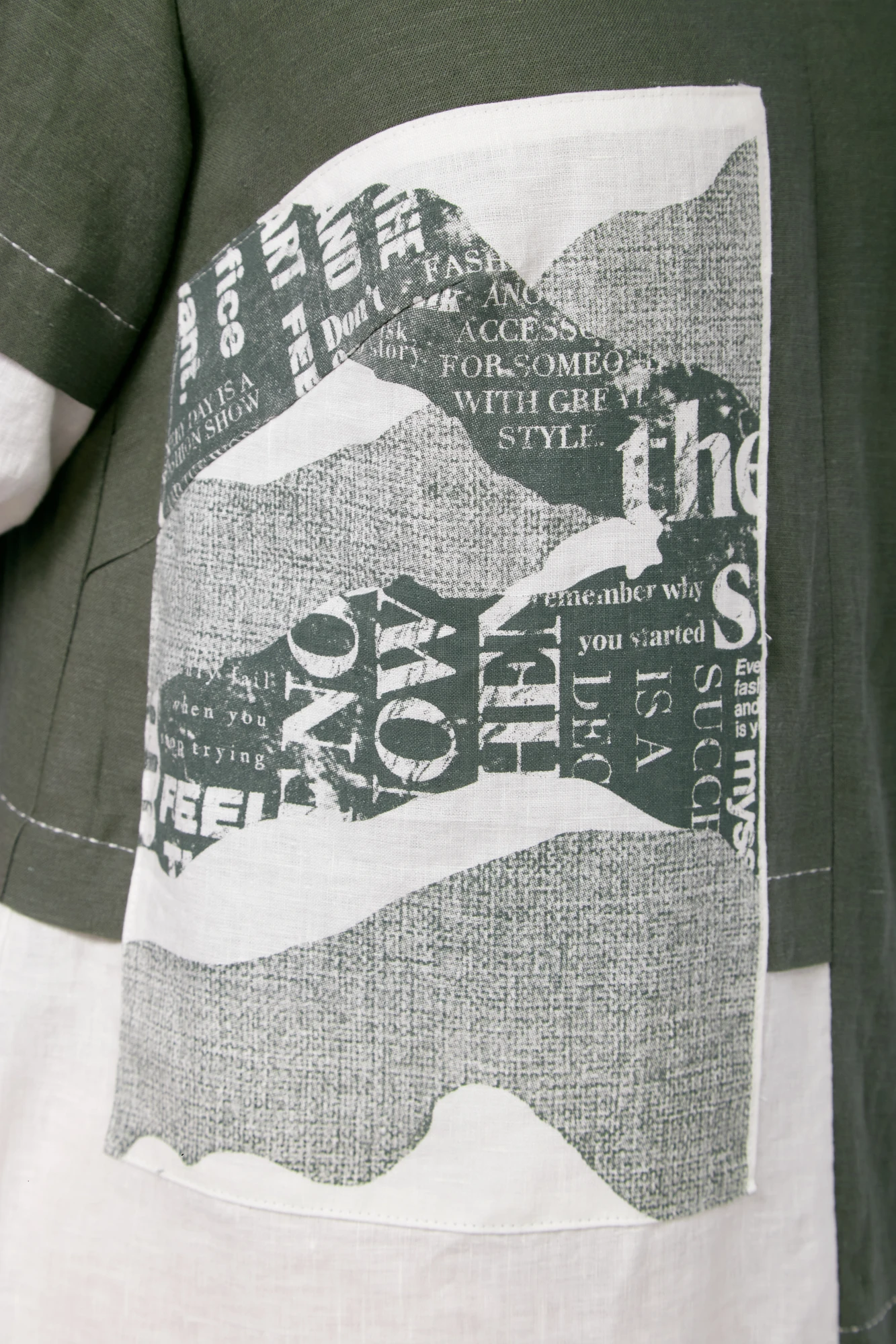 Платье женское совбодного кроя. Спинка с ассиметричными подрезами, средним швом, в низу с разрезом. Перед со средним швом, нагрудными вытачками, подрезами на разном уровне. На правой части переда настрочена деталь с печатью. Рукав втачной, одношовный, с декоративной отделочной деталью, собраной по низу на шнур в кулисе. По бокам низ собран на резинку. В качестве отделки спинки используется нашивка. Нашивка модет отличаться от заявленной на фото.