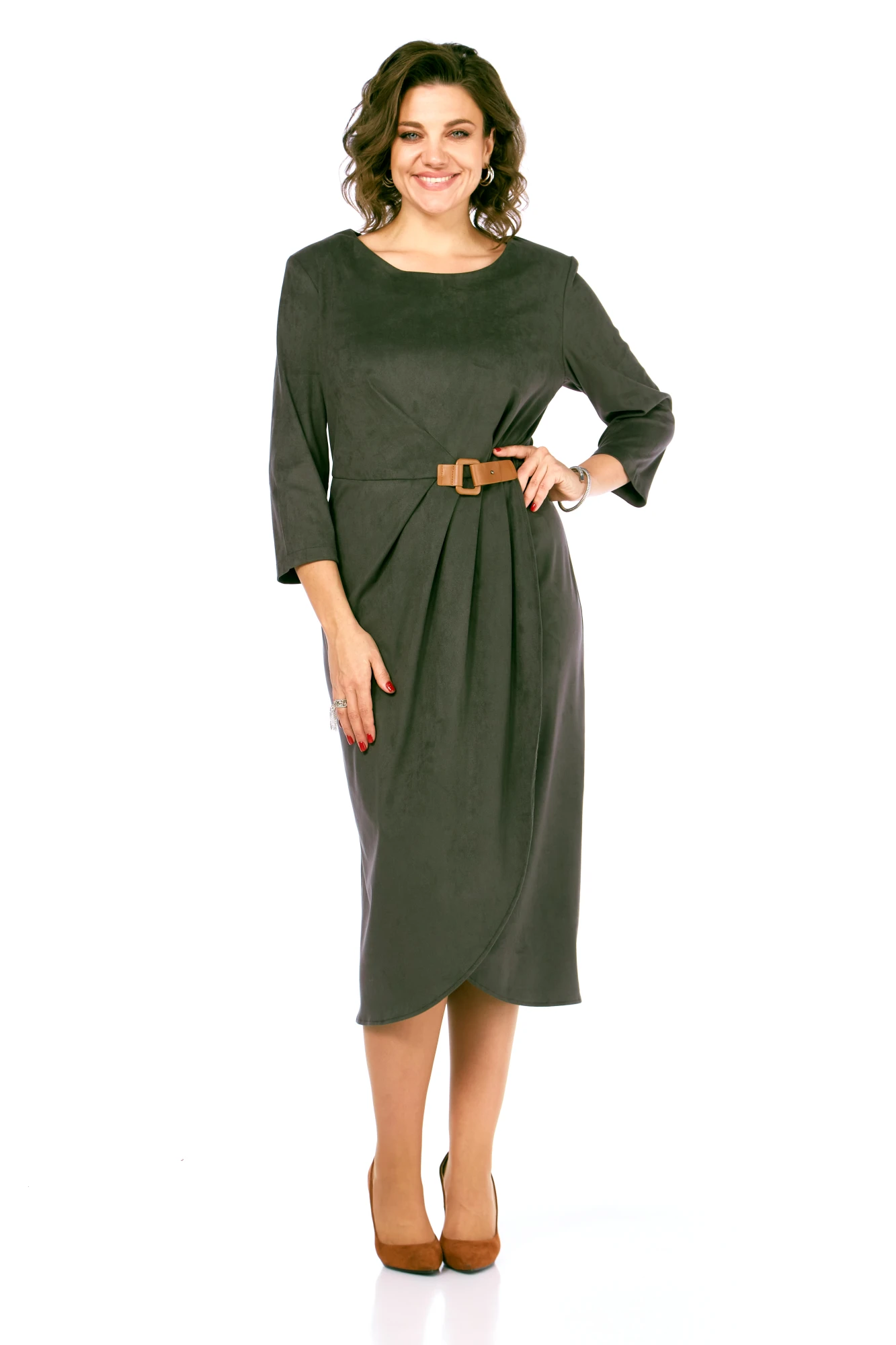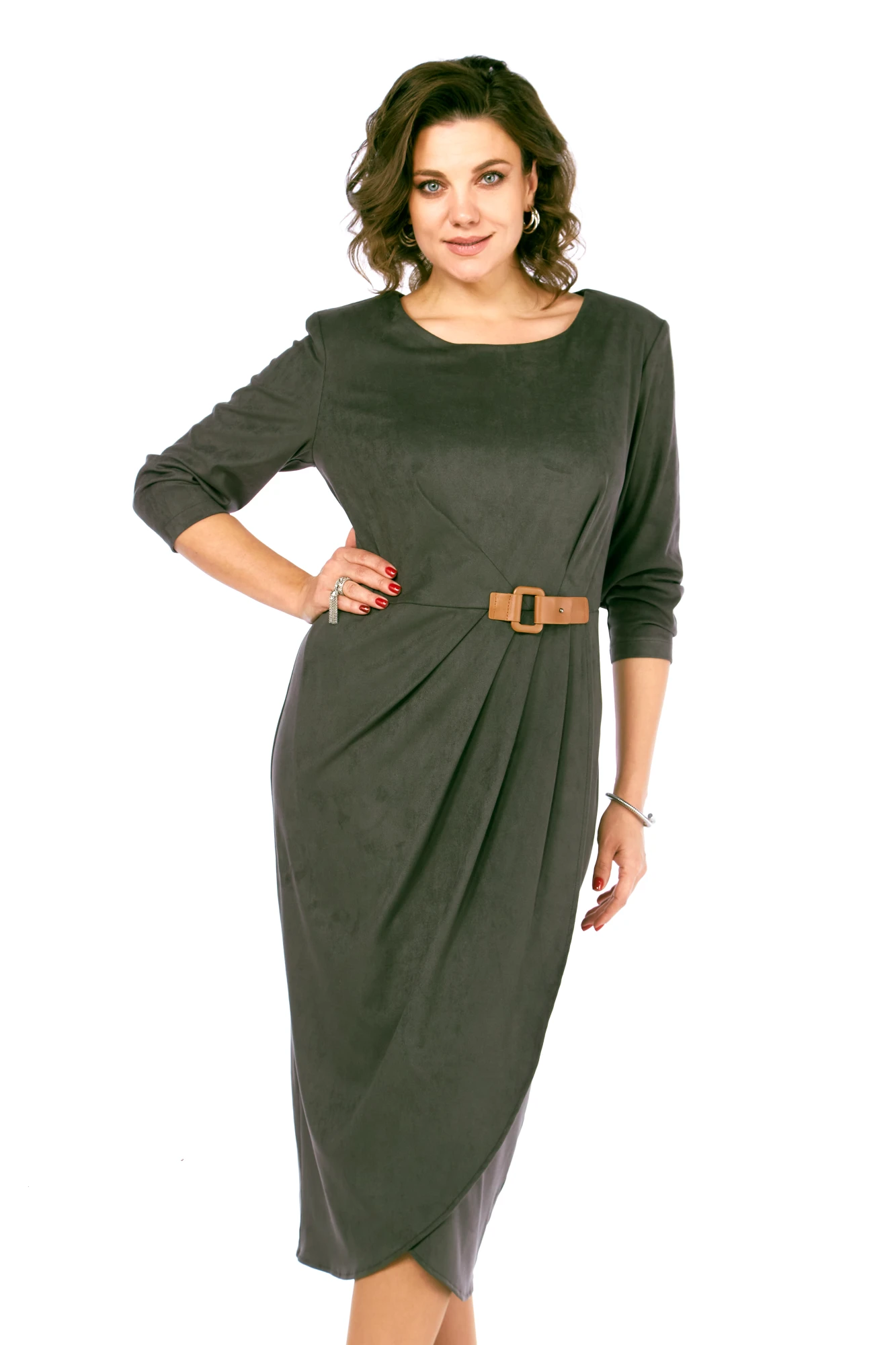 Платье женское полуприлегающего силуэта. Спинка со средним швом. Перед отрезной по линии талии. Верхняя часть с 2-мя мягкими складками, нижняя часть с запахом и 4-мя мягкими складками. Полы запаха округлой формы. В области складок декор-пряжка. Горловина круглая, сзади застегивается на петлю и пуговицу. Рукав втачной, одношовный с локтевой вытачкой. Фурнитура может отличаться от заявленной на фото.