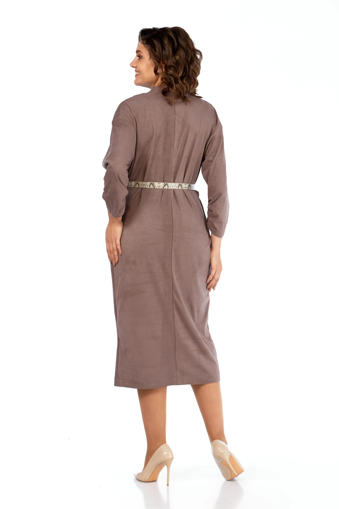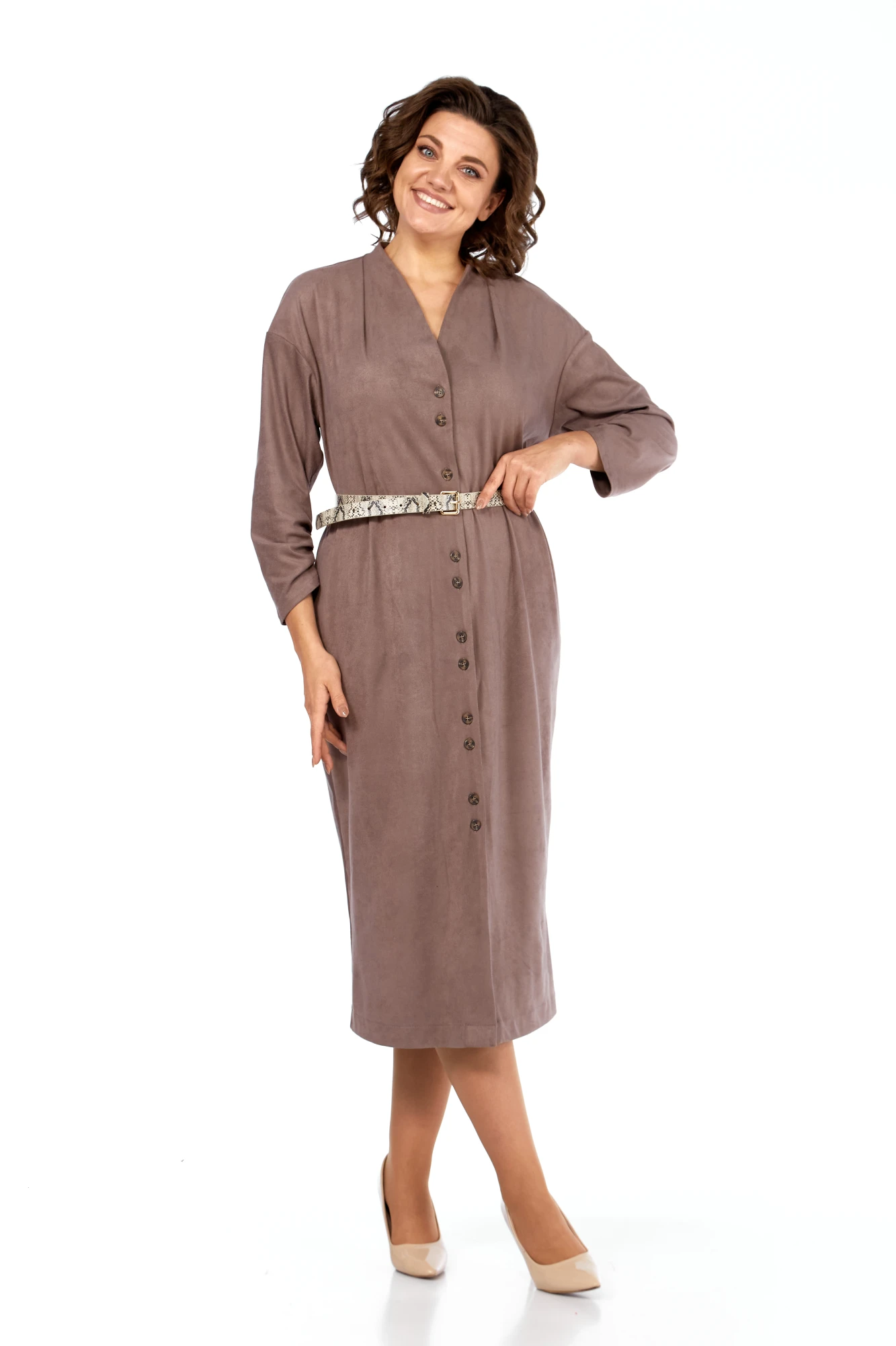 Платье женское поплуприлегающего силуэта с застежкой на петли и пуговицы. Спинка со средним швом. Полочка с мягкой складкой у горловины. Боковые карманы обработаны в швах с частично настроченной мешковиной. Рукав со спушенной линией плеча, втачной, одношовный с 3-мя мягкими складками снизу. Воротник-стойка цельнокройная с полочкой. В комплекте ремень из эко-кожи. Фурнитура может отличаться от заявленной на фото.