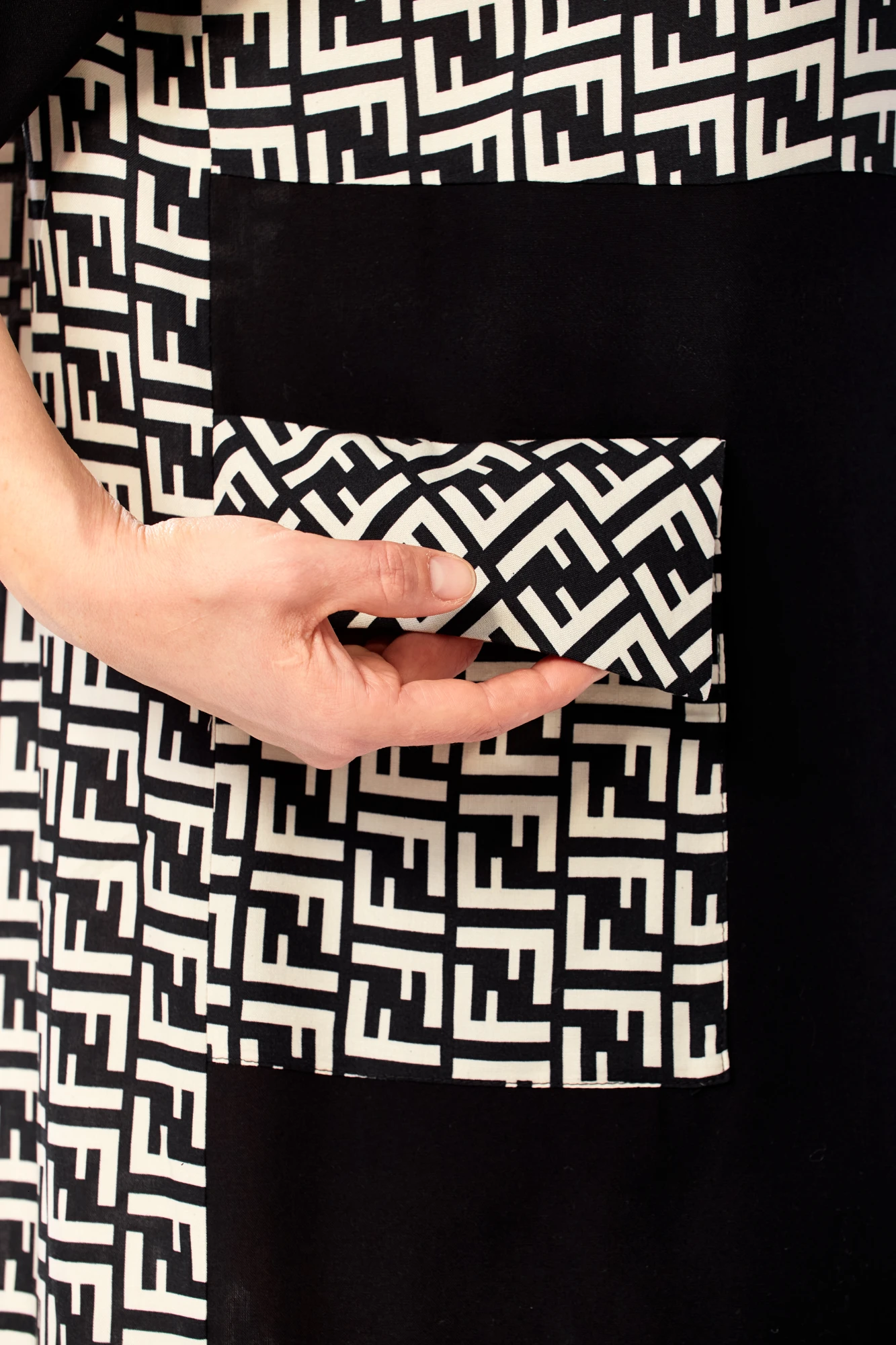 Платье женское свободного кроя с центральной застежкой на петли и пугоцы. Спинка окрглой формы. Перед с подрезом на талии. Платье из 2-ух видов ткани, расположенных в шахматном порядке. На правой половине боковой накладной карман с клапаном. Воротник рубашечный на стойке. Рукав втачной одношовный длиной 7/8 с хлястиком с возможностью регулировки длины.