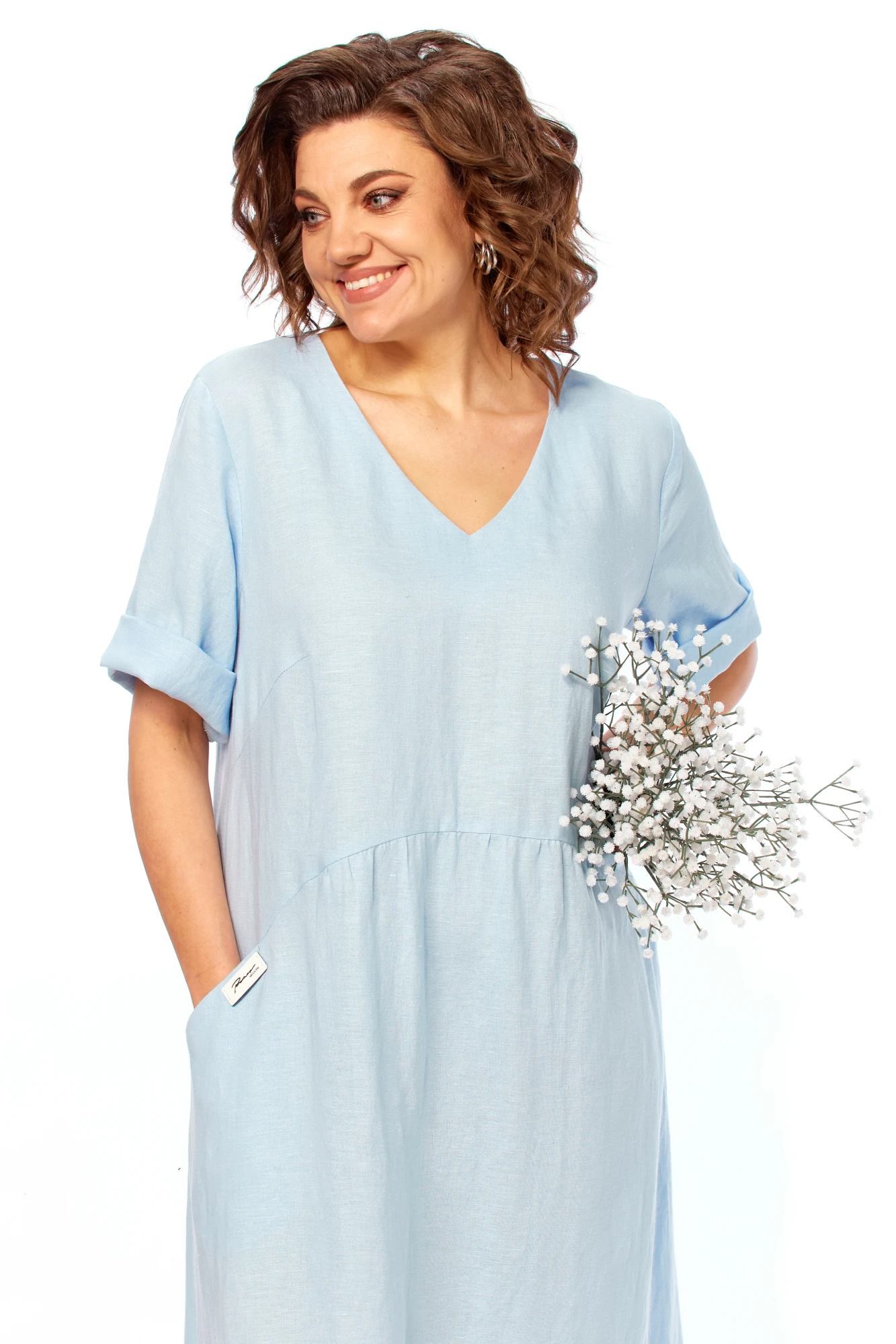 Платье женское свободного кроя . Спинка со средним швом и полукруглым подрезом в области талии. Перед с V-образной горловиной и полукруглым подрезом в области талии. В нижней части переда и спинки сборка в центральной части . Боковые карманы обработаны в шве подреза переда. Правый карман украшен нашивкой. Рукав втачной одношовный длиной до локтя. Фурнитура может отличаться от заявленной на фото.