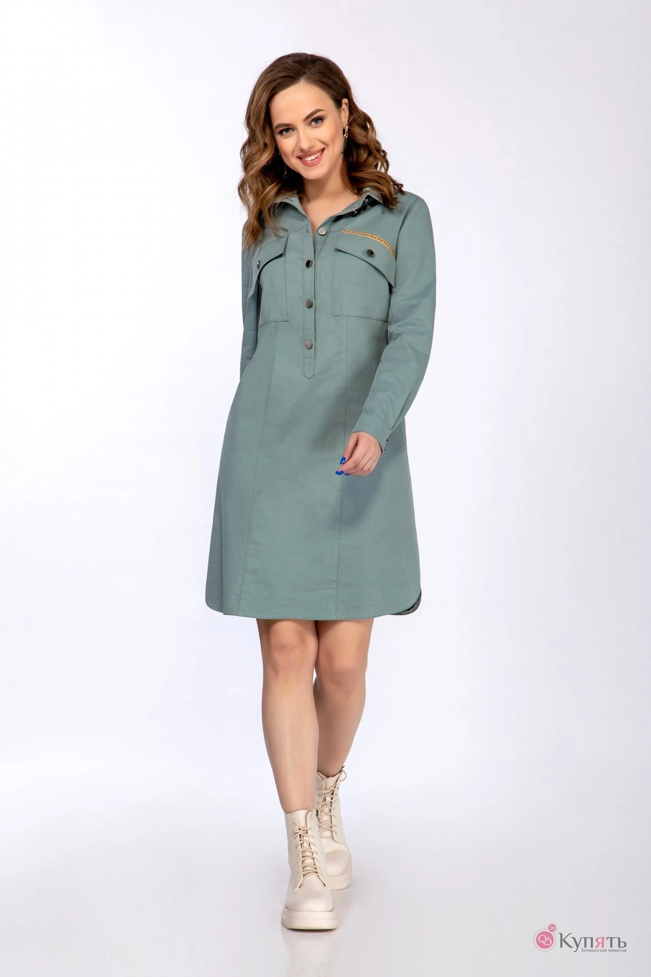 Перед с фигурными кокетками и двумя вертикальными рельефами. Платье с накладными карманами и клапанами, вставленными в шов кокетки. Платье с стояче-отложным воротником на отрезной стойке и отрезной планкой с фигурным концом, застегивающаяся на 5 пуговиц.