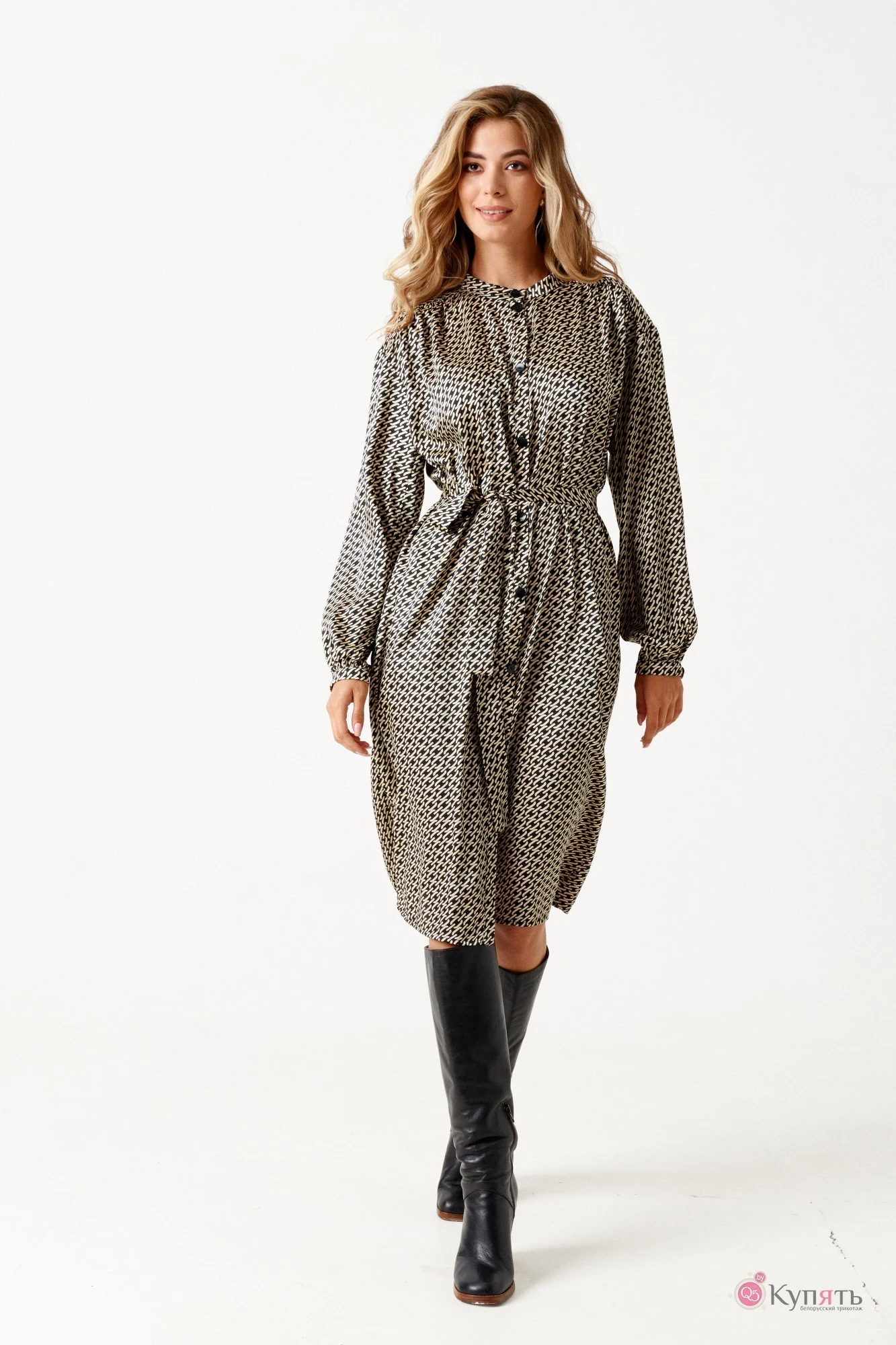 Платье женское, свободного силуэта, длиной ниже линии колен, из текстильной ткани. Перед с отрезными кокетками , отрезными планками, застежкой на пуговицы. Спинка с отрезной кокеткой на уровне лопаток. Вырез горловины обработан воротником -стойкой. Рукав втачной, одношовный, по низу обработан притачной манжетой. Платье на отлетной подкладке-комбинация. В комплекте пояс из основной ткани.