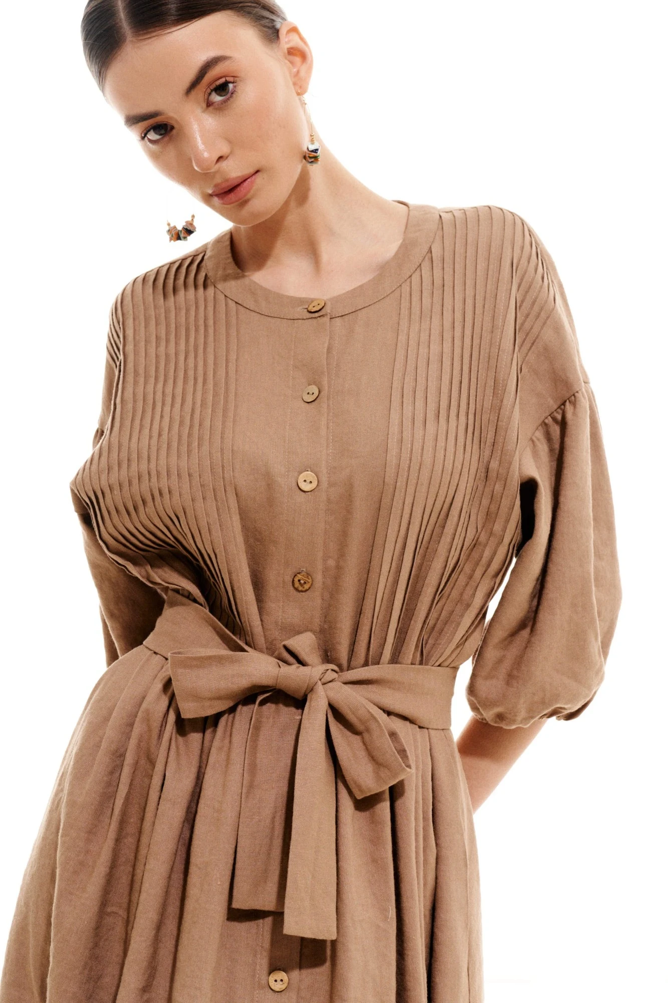 Платье женское, свободного силуэта, длиной макси из костюмно-плательной ткани, со спущенной линией плеча. Перед с защипами, центральной цельнокроеной планкой и застежкой на петли, пуговицы. В боковых швах функциональные карманы. Рукав одношовный, длиной до локтя, по окату со сборкой и присборен снизу на резинку. Горловина круглой формы, обработана воротником стойкой. В комплекте декоративный пояс из основной ткани.