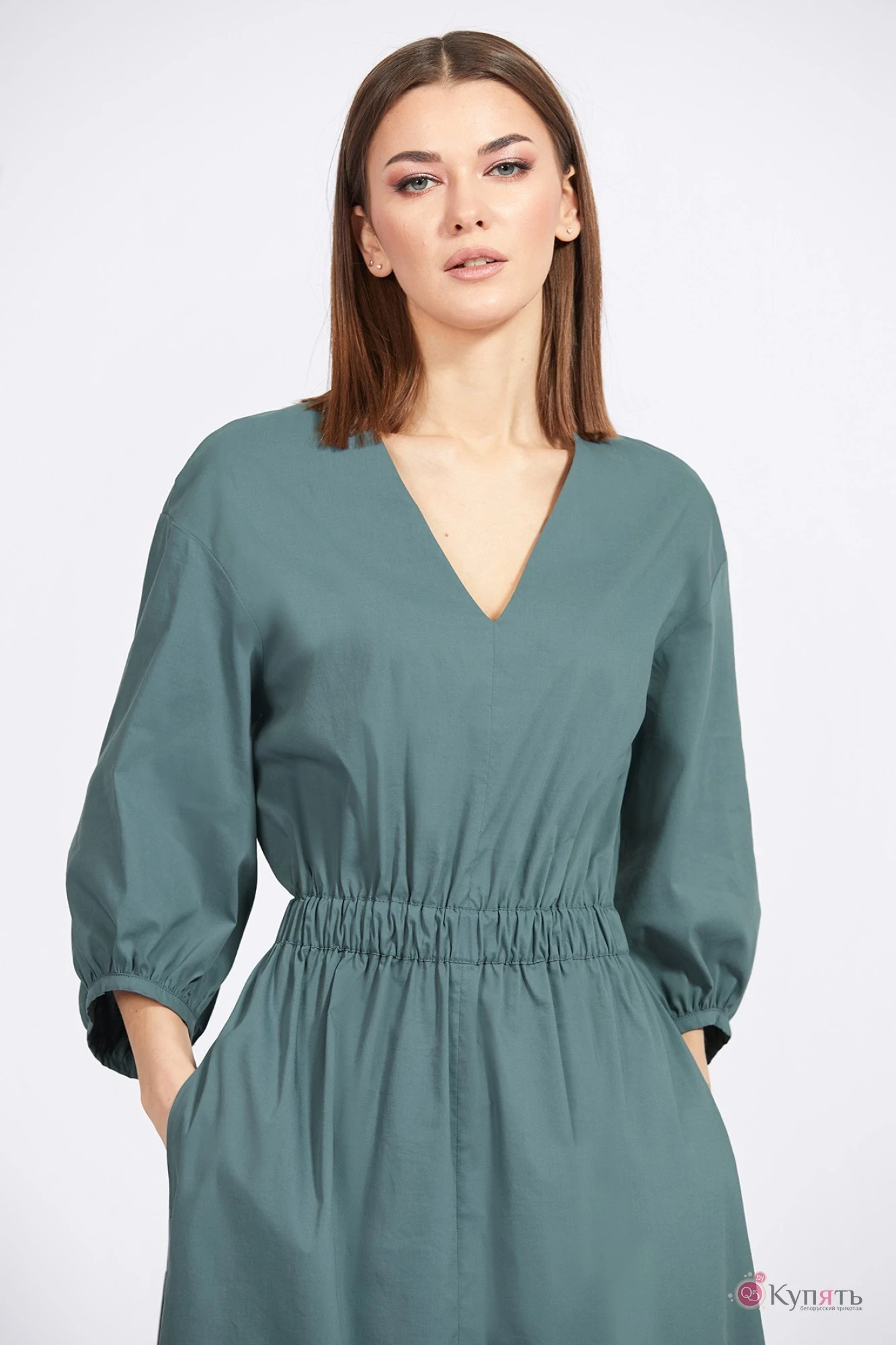 Платье выполнено из однотонной плательно-блузочной ткани. Платье Х-образного силуэта, длиной миди. Перед со средним швом, в котором обработан разрез. Спинка цельная. Горловина переда V-образной формы. Плечевой шов спущен. Рукав одношовный, длиной 3/4, со сборкой по низу. Низ рукава обработан бейкой. По линии талии настрочена кулиса с эластичной тесьмой. Платье декорировано нашивкой по спинке.