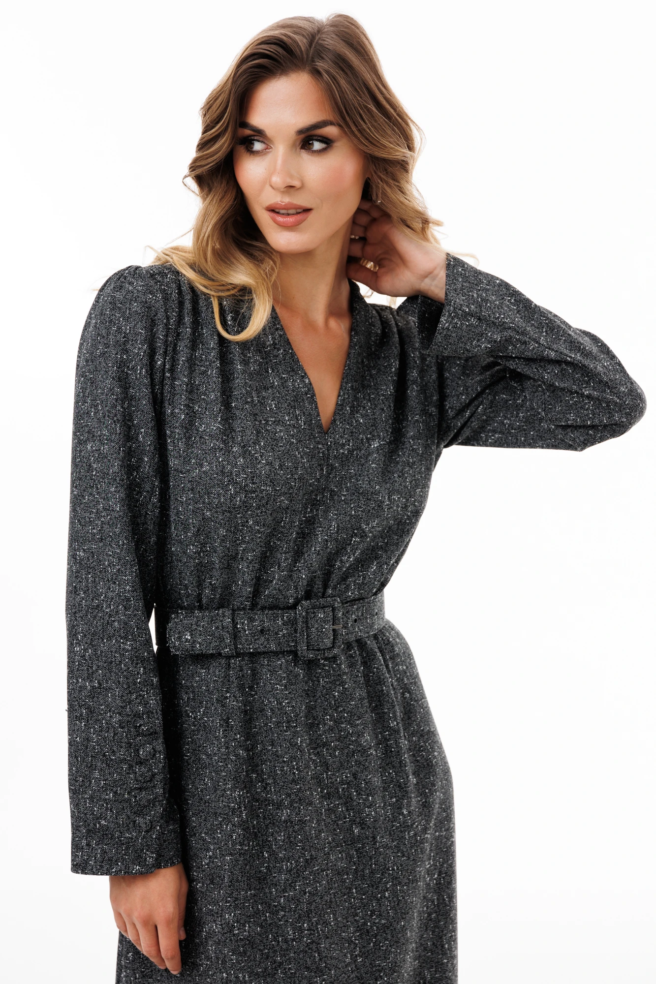 Платье выполнено из костюмной ткани меланж. Платье Х-образного силуэта, отрезное по линии талии, длиной миди. Спереди лифа кокетка со сборкой. Горловина V-образной формы. На спинке средний шов, кокетка и сборка от нее. Плечевой шов отсутсвует. Рукав втачной, двухшовный со сборкой по окату. В переднем шве рукава щлица, с застежкой на пуговицы. Юбка слегка расширена к низу. По линии талии эластичная тесьма. В левом боковом шве застежка на потайную молнию. Платье на отлетной по низу подкладке. В комплект входит ремень из основной ткани с обтяжной пряжкой.