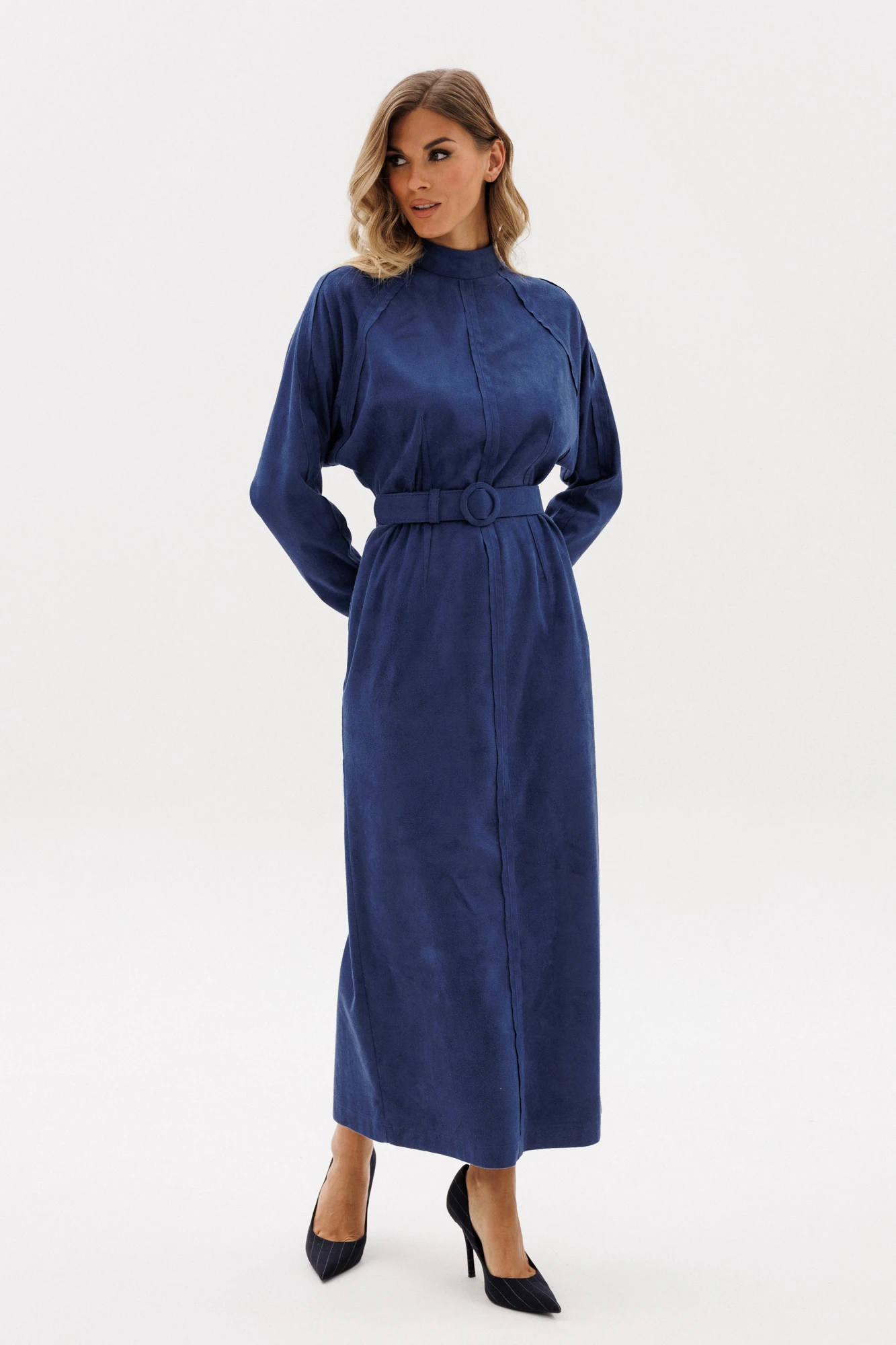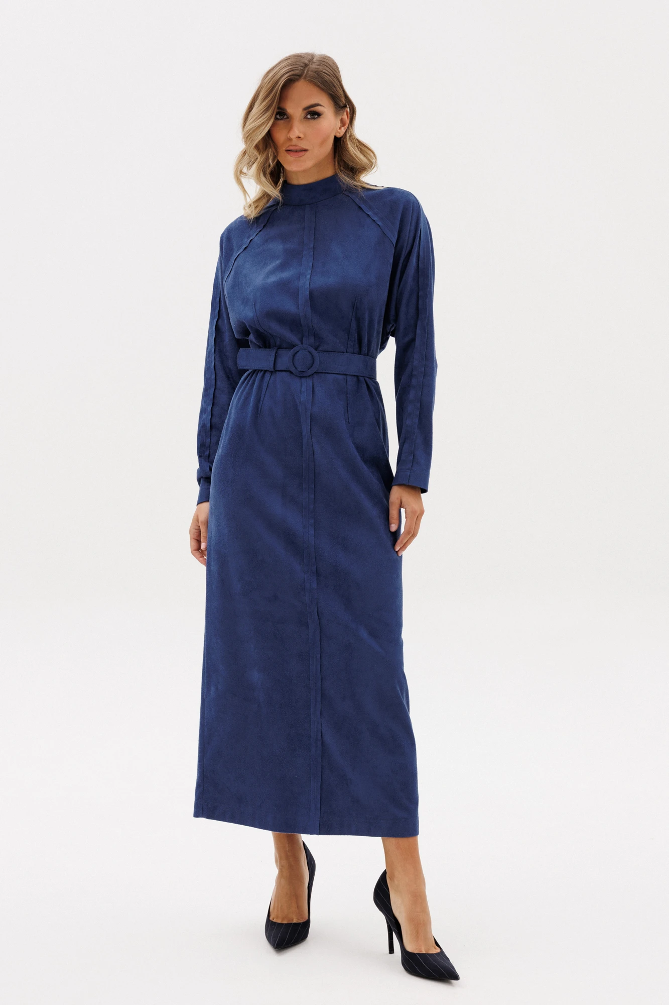 Платье выполнено из тонкой искуственной замши. Платье полуприлегающего силуэта, длиной миди. Платье отрезное по линии талии. Спереди и на спинке талиевые вытачки и средний шов. Застежка на потайную молнию в среднем шве спинки. Воротник-стойка. Рукав покроя реглан. Средний шов переда, талиевые вытачки, верхний шов рукава и линии реглана обработаны "на лицо". В комплект входит съемный ремень из основной ткани с обтяжной пряжкой.