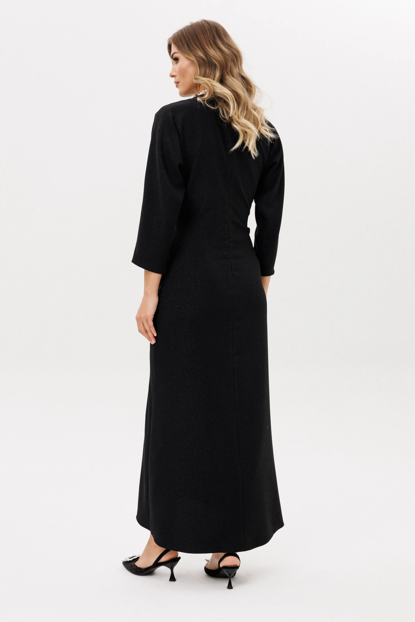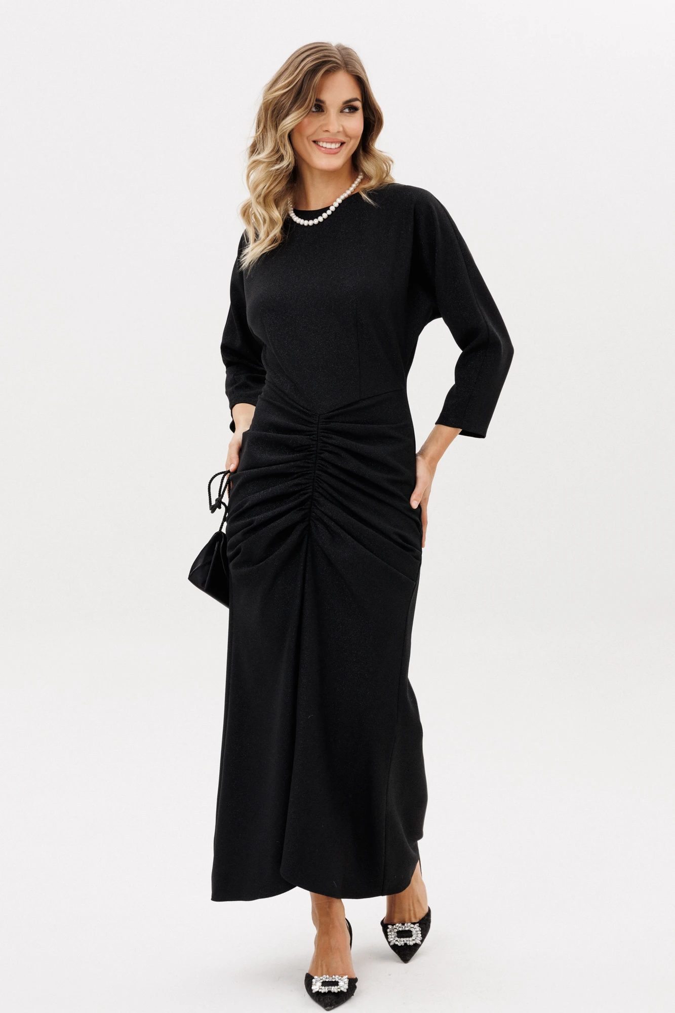 Платье выполнено из костюмно-плательной ткани с блеском. Платье Х-образного силуэта длиной миди. Спереди по нижней части средний шов и драпировка. Застежка на потайную молнию сзади в среднем шве спинки. Горловина округлой формы. Рукав цельнокроеный, покроя ""кимоно"", двухшовный, длиной 3/4. Низ платья фигурной формы, по спинке длинее переда.