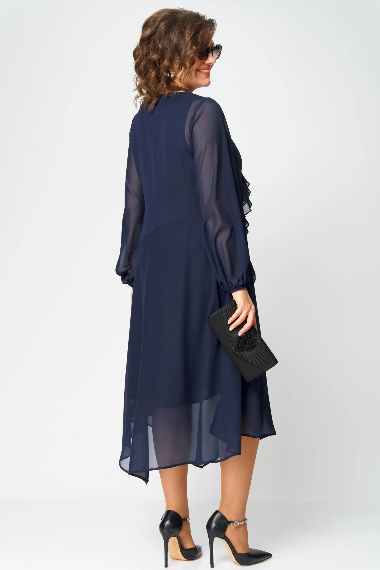 Платье женское нарядное полуприлегающего силуэта на трикотажной подкладке расширенное к низу выполнено из шикарного шифона. Вырез горловины V-образный, рукав втачной по низу собран на резинку. По полочке нагрудные вытачки и фигурные подрезы с двойными воланами. Низ платья фигурный. Декоро платья служат воланы и дизайн самой ткани.