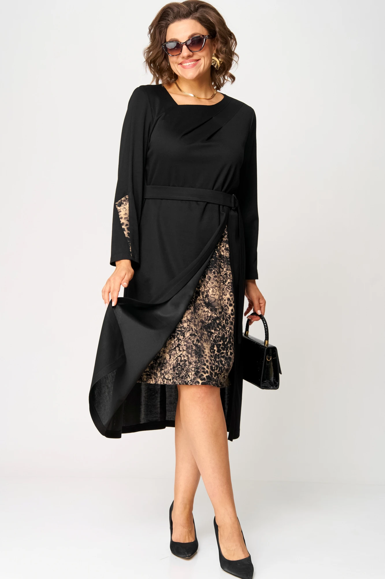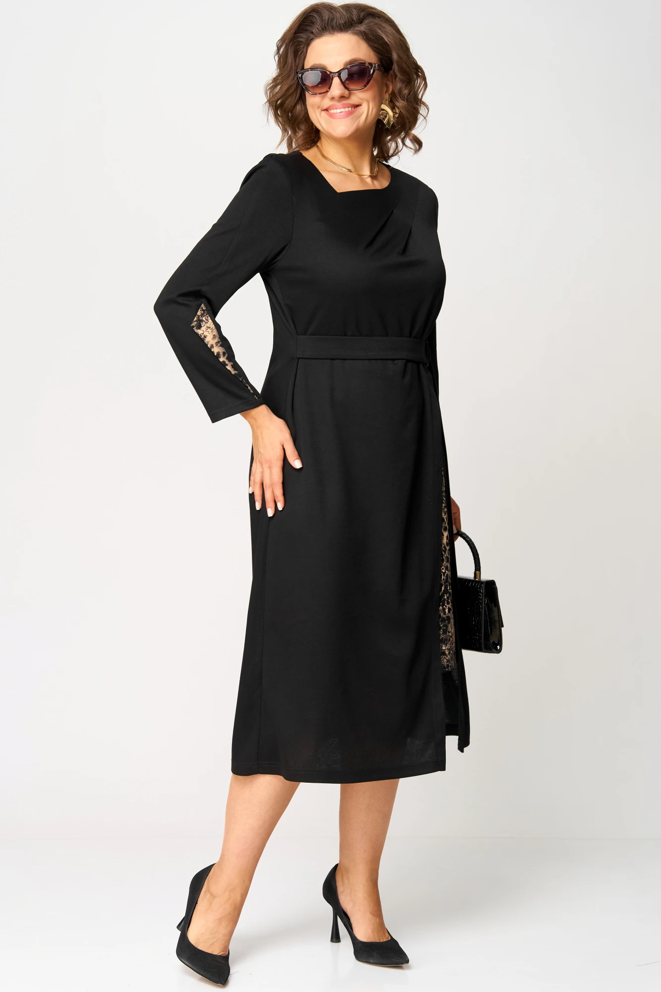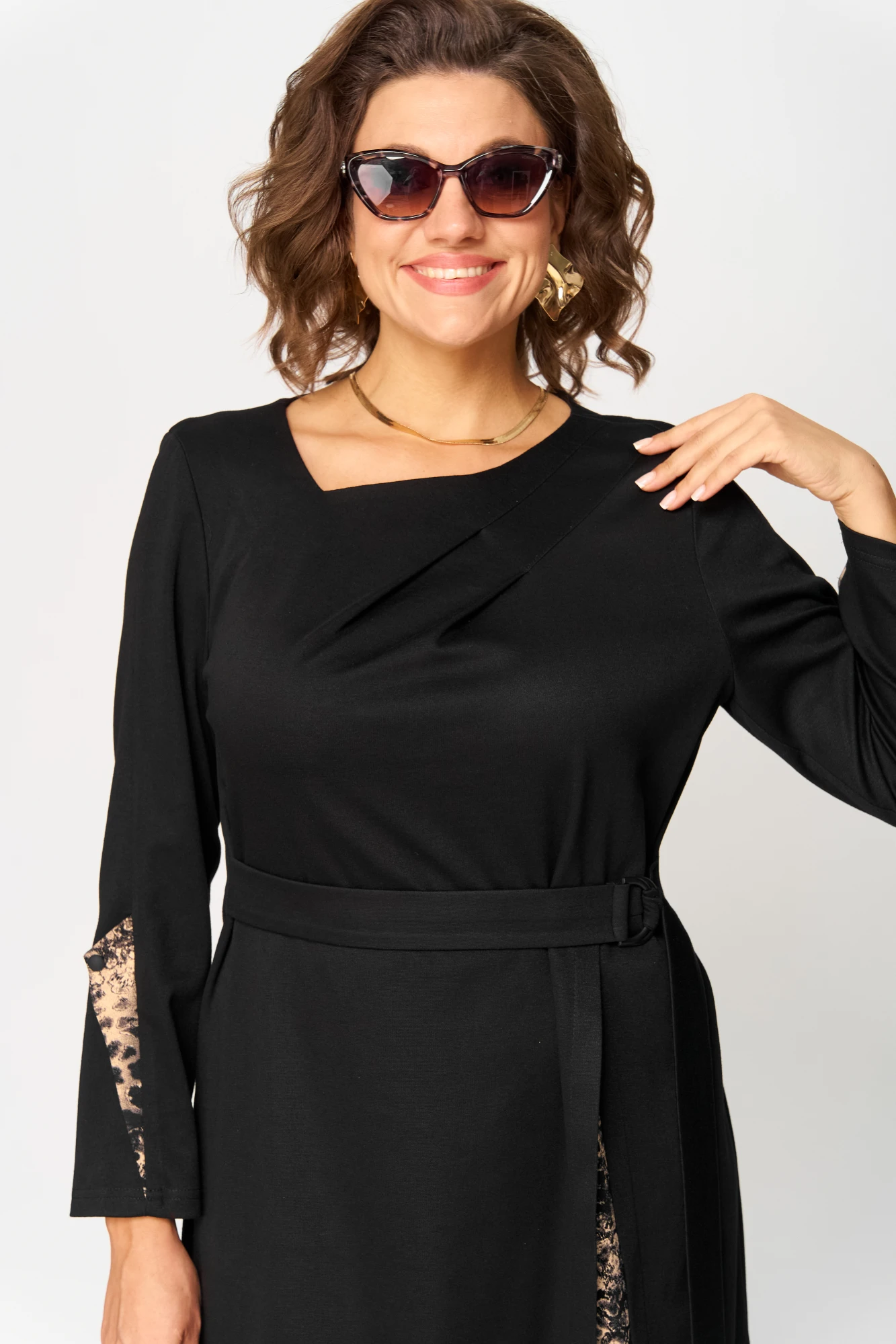 Платье женское повседневное полуприлегающего силуэта, выполнено из трикотажного полотна в сочетании с отделкой. Вырез горловины V-образный на обтачке. Рукав втачной 7/8 по низу нв притачной манжете из отделочной ткани. По переду платье с выточками и отрезными ассиметричными элементами из отделочной ткани. По центру платья обработан небольшой разрез. Декором служит сьемный пояс из основной ткани.
