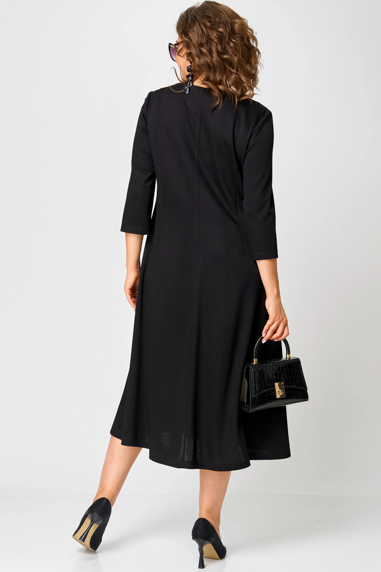 Платье женсоке повседневное полуприлегающего силуэта расширенное к низу, выполнено из трикотажного полотна двух дизайнов. Вырез горловины круглый на обтачке. Рукав втачной 3/4. Спинка платья выполнена из однотона, полочка с отделочными вставками из цветного трикотажа. В одном боковом шве обраборан разрез. Декором платья служат вставки из отделочного трикотажа.