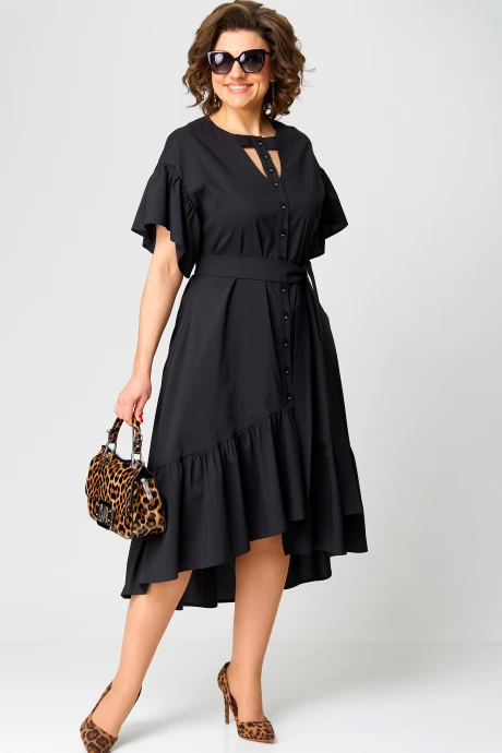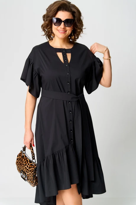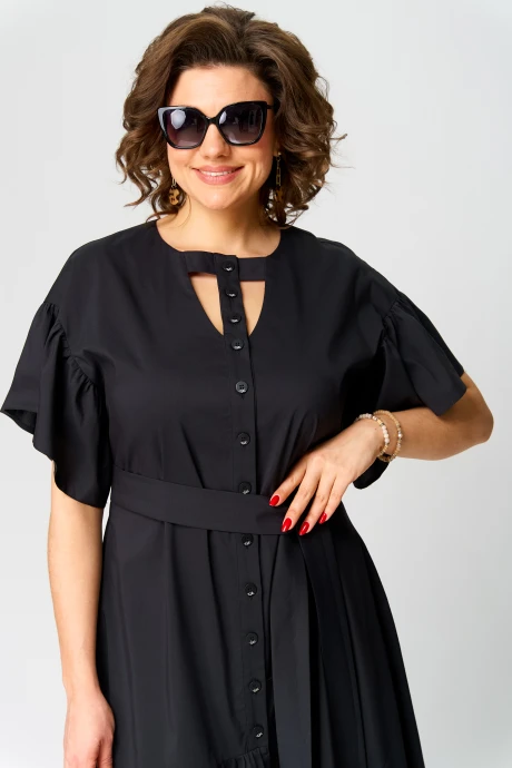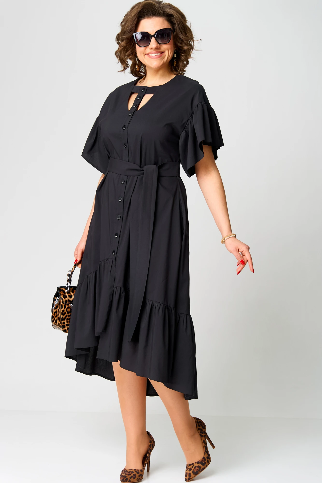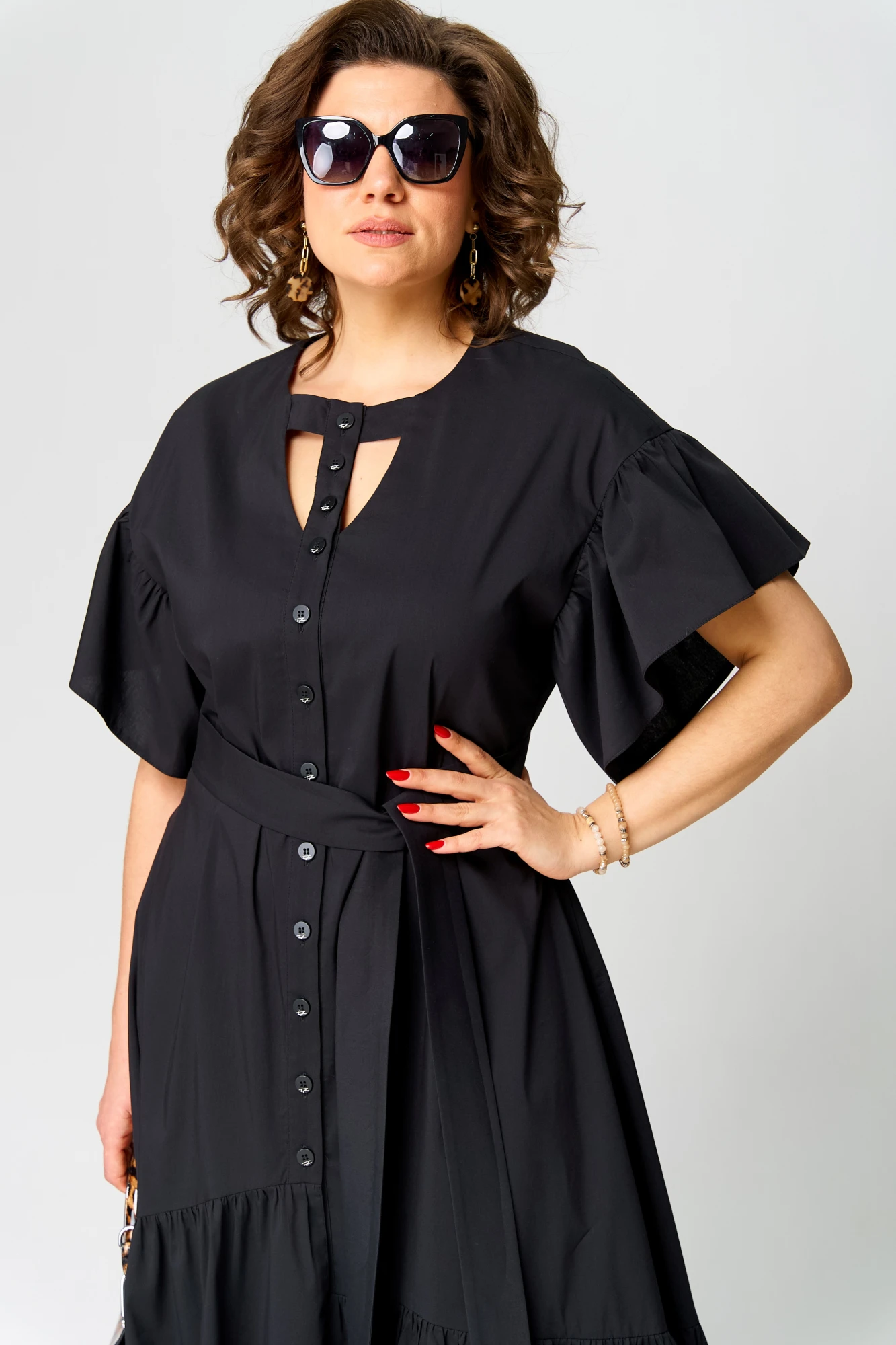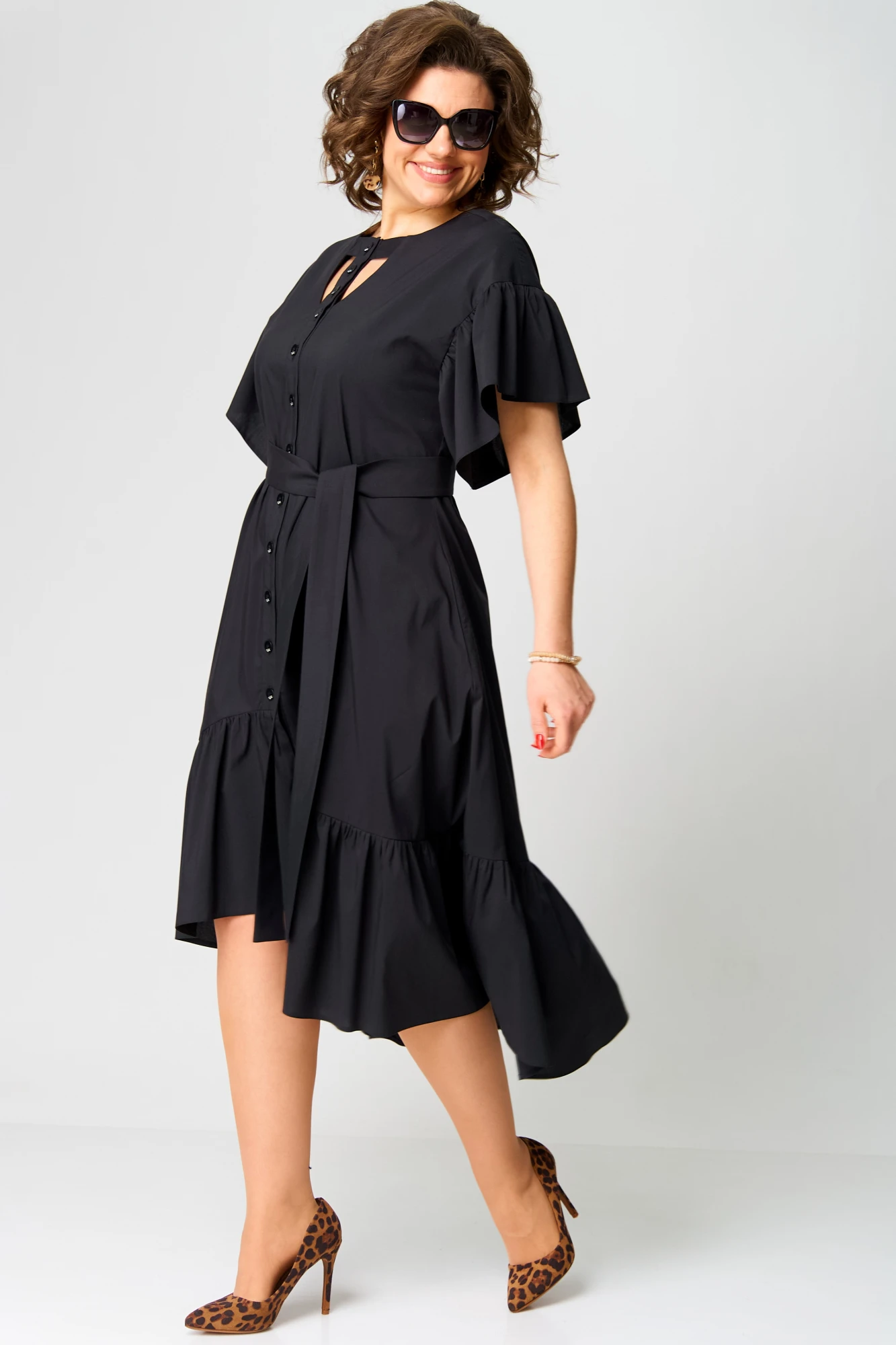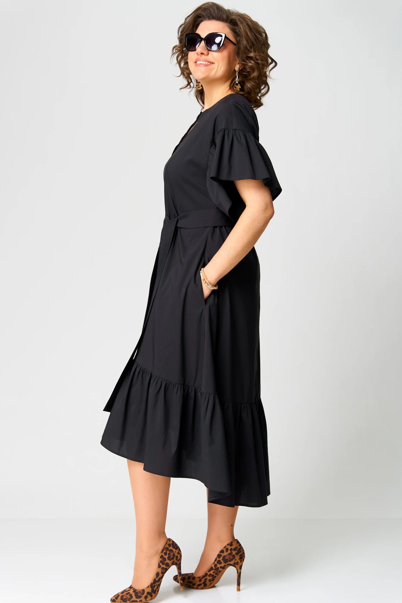 Платье женское нарядно-повседневное полуприлегающего силуэта расширенное к низу с ассиметричным воланом. Выполнено из хлопка. Вырег горловины круглый по центру с отделоным элементом. Планка - застежка до верху на обметанне петли и пуговицы. Рукав спущенный по низу с притачным воланом со сборкой. В боковых швах обработаны карманы. Низ платья фигурный. Декором платья служит съемный пояс из основной ткани.
