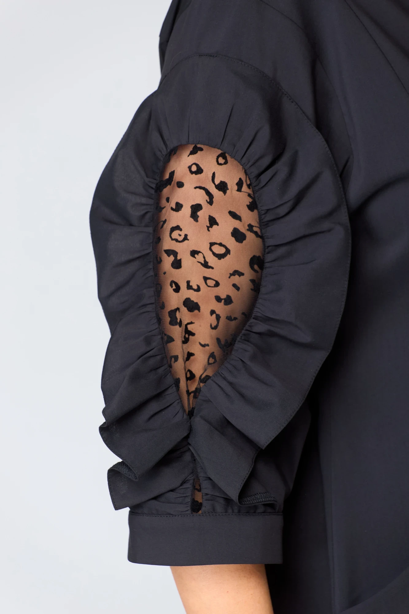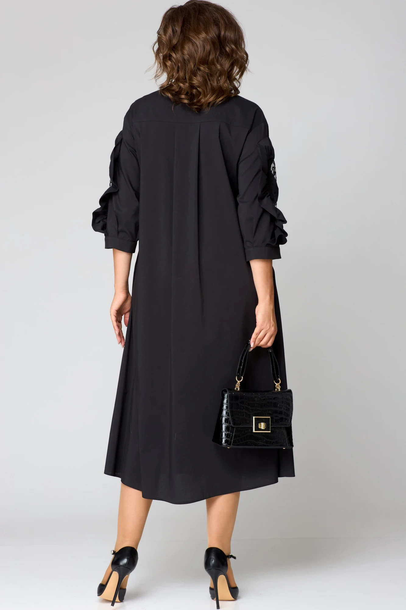 Платье жнское нарядно-повседневное полуприлегающего силуэта расширенное к низу выполнено из хлопка. Вырез горловины воротник на стойке рубашечного типа, застежка до талии на петли и пуговицы. Плечо спущенное, рукав втачной с декоративным элементом по центру в виже кружева и рюши. По низу рукв на манжете. По переду в рельефах платья обработаны карманы. По спинке кокетка и встречная складка. Декором служит отделка на рукавах и пуговицы со стразами.