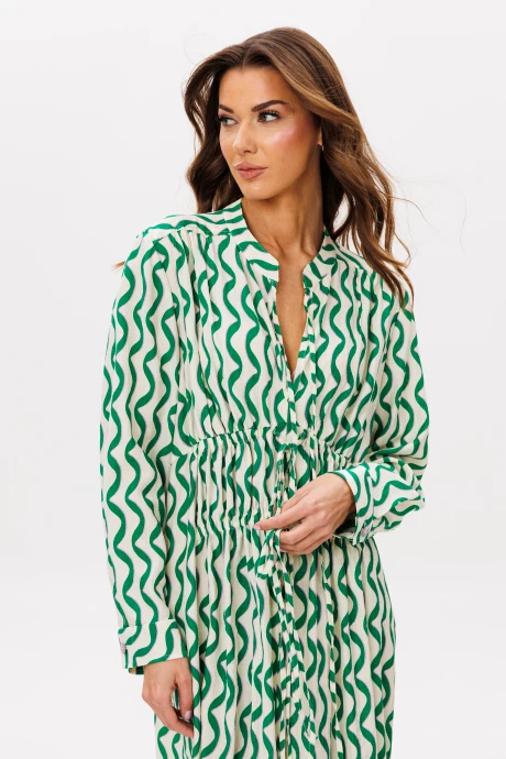 Платье становится ключевым элементом гардероба, предлагая нам баланс между удобством, женственностью и яркими акцентами. Комфортное вискозное полотно, необычный фасон и дерзкий принт. Свободный а-силуэт, втачной покрой, воротник-стойка, комфортный длинный рукав на манжете по низу. Полочка с отрезной кокеткой и диагональными кулисами, по линии ниже груди, с отделочными завязывающимися шнурами. Спинка с отрезной кокеткой. Рукав с разрезом и складкой по линии притачивания манжеты. Длина платья около 105 см. Длина рукава около 62 см.