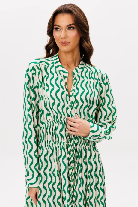 Платье становится ключевым элементом гардероба, предлагая нам баланс между удобством, женственностью и яркими акцентами. Комфортное вискозное полотно, необычный фасон и дерзкий принт. Свободный а-силуэт, втачной покрой, воротник-стойка, комфортный длинный рукав на манжете по низу. Полочка с отрезной кокеткой и диагональными кулисами, по линии ниже груди, с отделочными завязывающимися шнурами. Спинка с отрезной кокеткой. Рукав с разрезом и складкой по линии притачивания манжеты. Длина платья около 105 см. Длина рукава около 62 см.