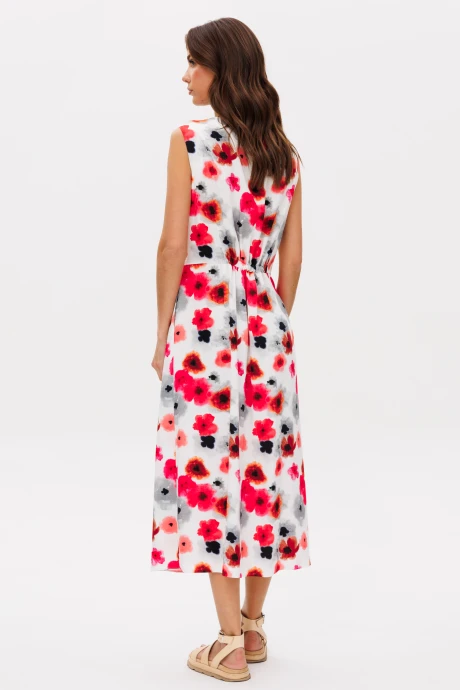 Платье из комфортного вискозного полотна, А-образного силуэта, без рукава, с эффектными отлетными деталями. Полочка с отрезным лифом с вытачкой, изящной драпировкой-поясом, и отлетными деталями на юбке. Спинка отрезная по линии талии, с частичной эластичной кулисой по центру спинки.