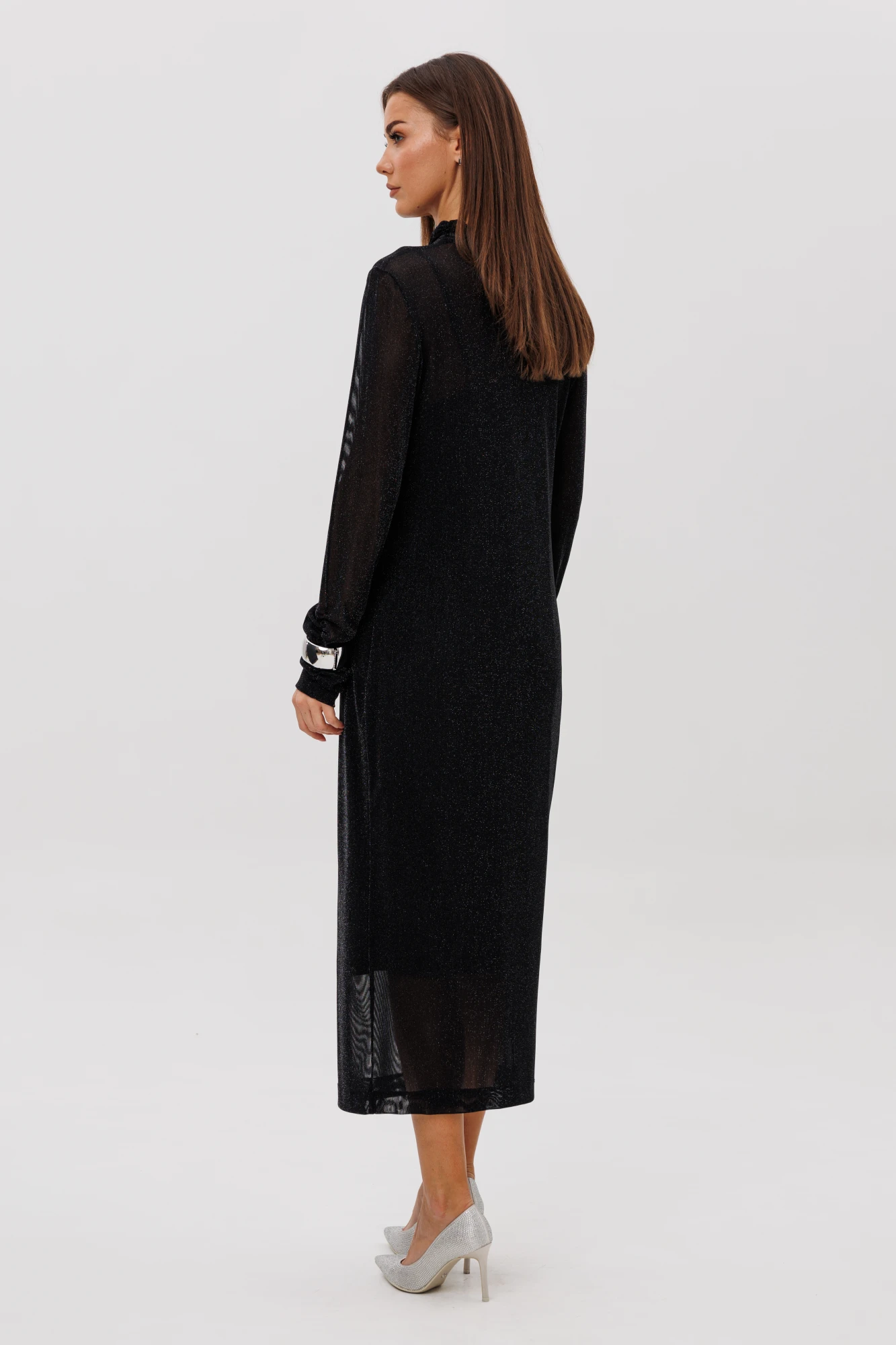 Женственное платье втачного покроя выполнено из мерцающей сетки, красиво играющей при движении. Драпированные рукава и стоячий воротник добавляют утончённости, а подкладка-чехол обеспечивает комфорт и идеальную посадку. Образ одновременно выдержанный, современный и эффектный.