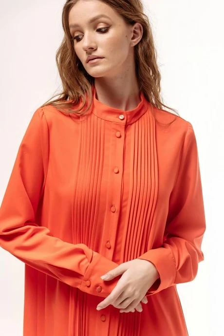 Платье свободного силуэта. Характеристики: выполнено из плательной ткани в цвете василек, застежка - планка на петли и пуговицы, по переду декоративные защипы, по низу рукава обработан манжет на петли и пуговицы, по горловине обработана стойка. Длина платья 124 см, длина рукава 64 см.