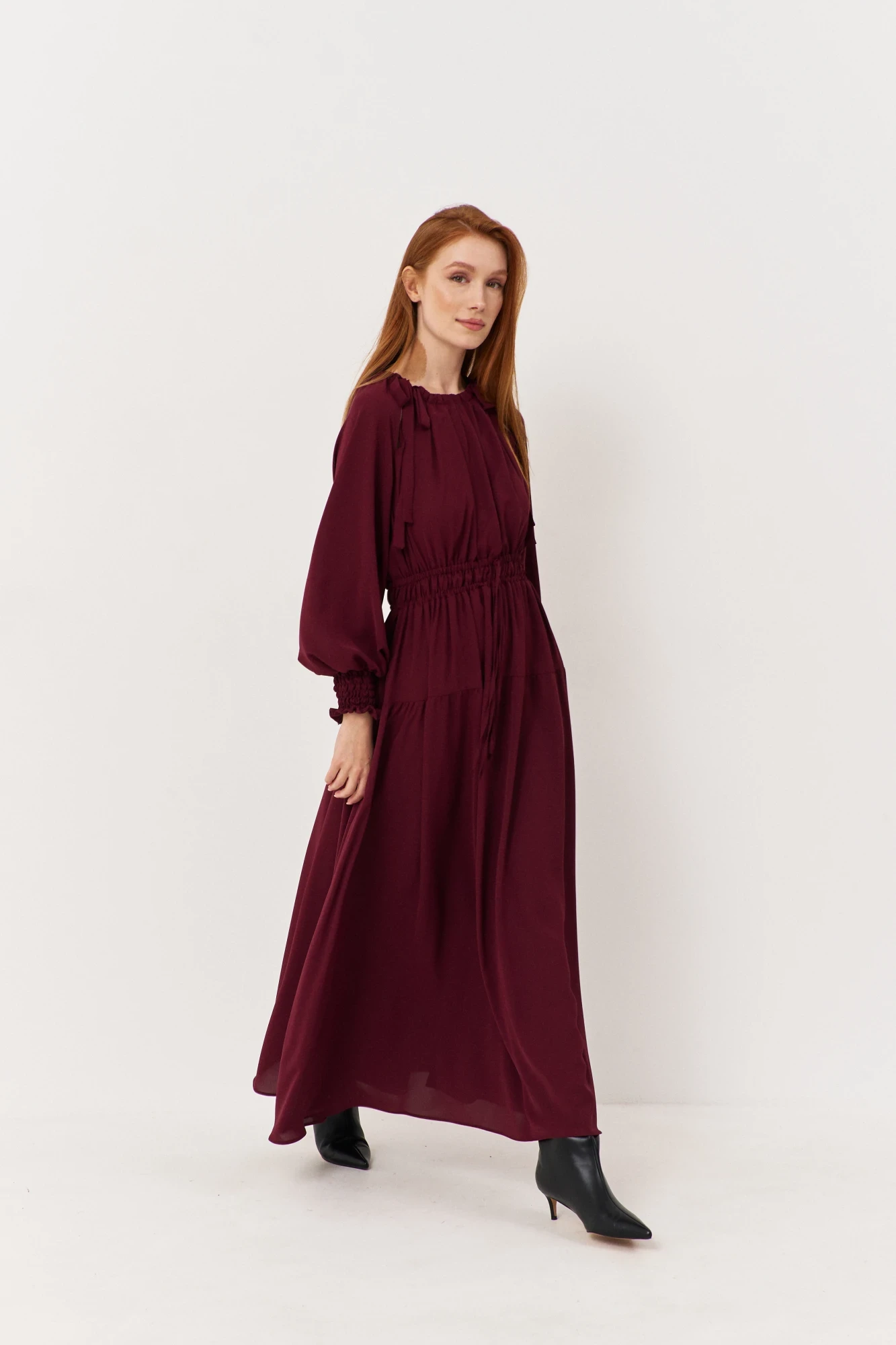 Платье макси с декоративными завязками по горловине. Характеристики: выполнено из плательной ткани в цвете бургунди, на резинке по линии талии, по горловине обработаны декоративные завязки, низ рукава на резинке. Длина платья 139 см, длина рукава 62 см.