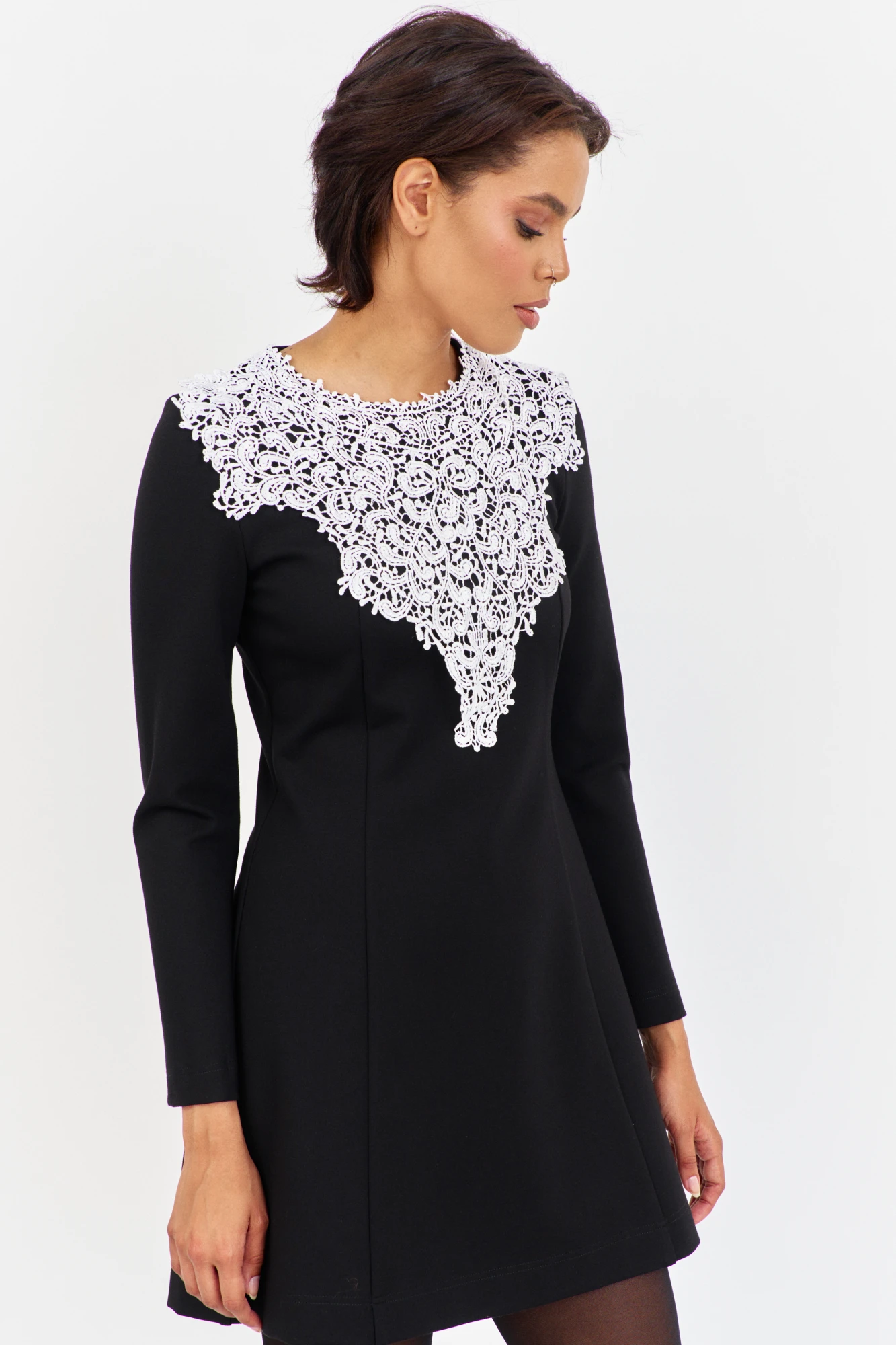 Платье А-силуэта с декоративным кружевным воротником. Характеристики: выполнено из плательной ткани в черном цвете, по переду кружевной воротник, по спинке застежка-молния, рукав двухшовный. Длина платья 87 см, длина рукава 60 см.