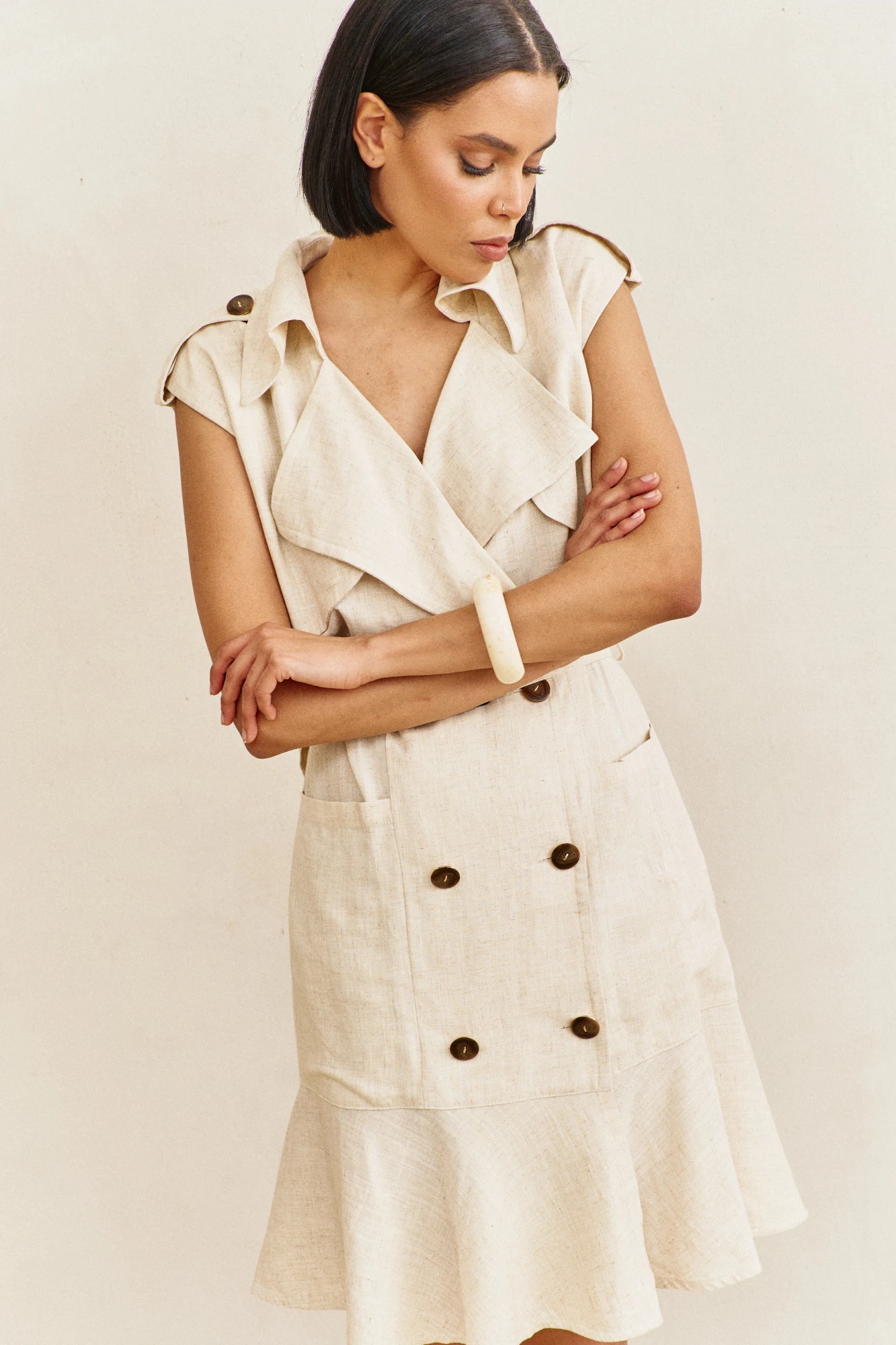 Платье-тренч с кокетками и воланом. Характеристики: выполнено из плательной ткани в бежевом цвете, со смещенной застежкой на петли и пуговицы, по переду отлетные кокетки, волан по переду и спинке, пояс съемный, по плечам паты. Длина платья по переду 99 см.