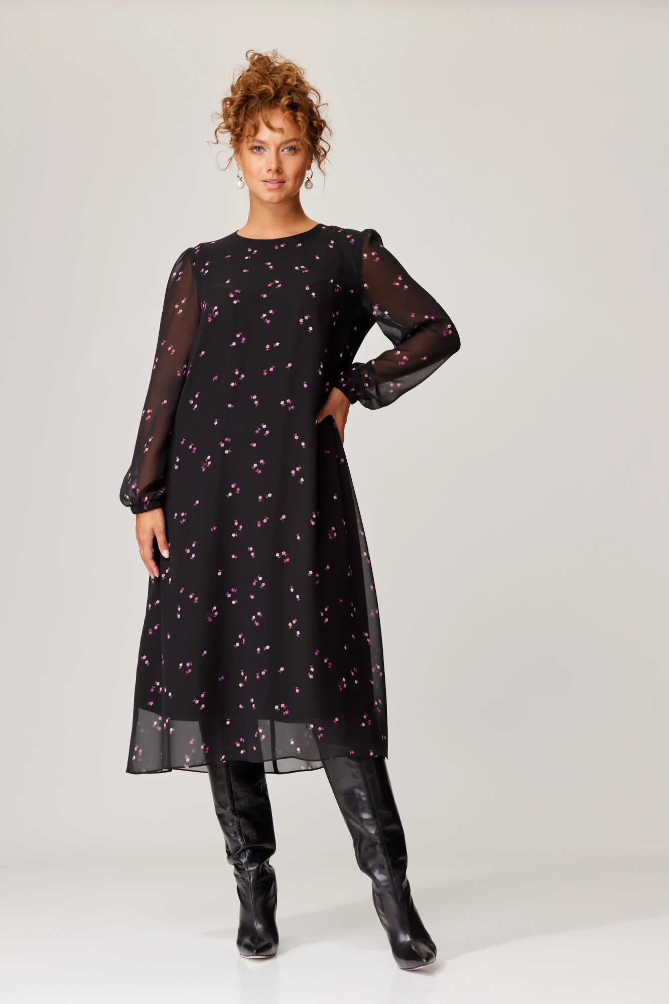 Платье женское А- образного силуэта на подкладке. Полочка с двумя нагрудными вытачками. Спинка со средним швом, в верху обработан разрезик с застежкой на петлю и пуговицу. Рукав длинный со сборкой по окату. Низ рукава на резинке шириной 2см. Горловина обработана подкладкой. К платью прилагается пояс из основной ткани. Длина изделия 115см., рукава 60см.