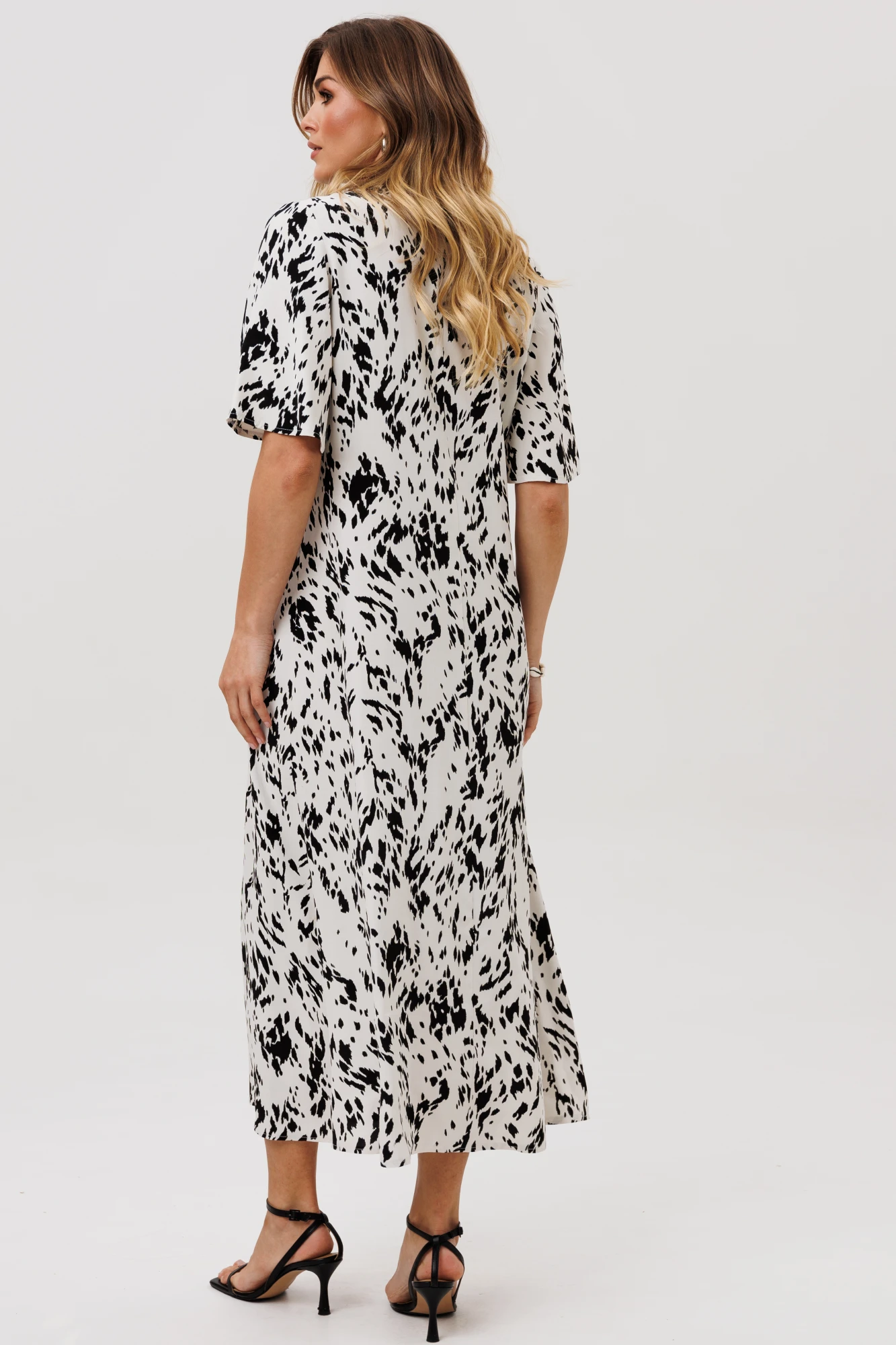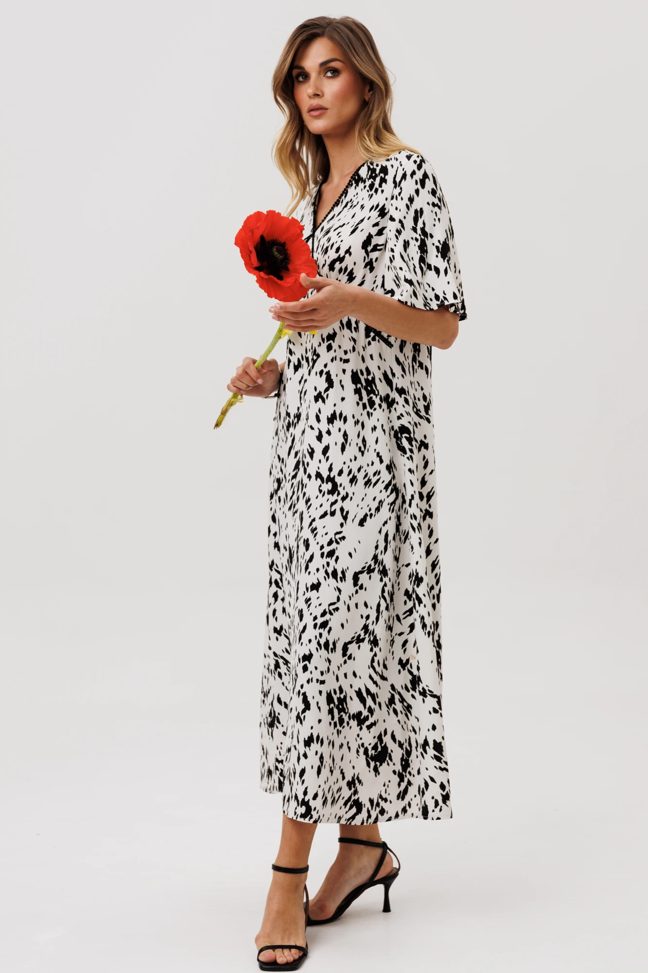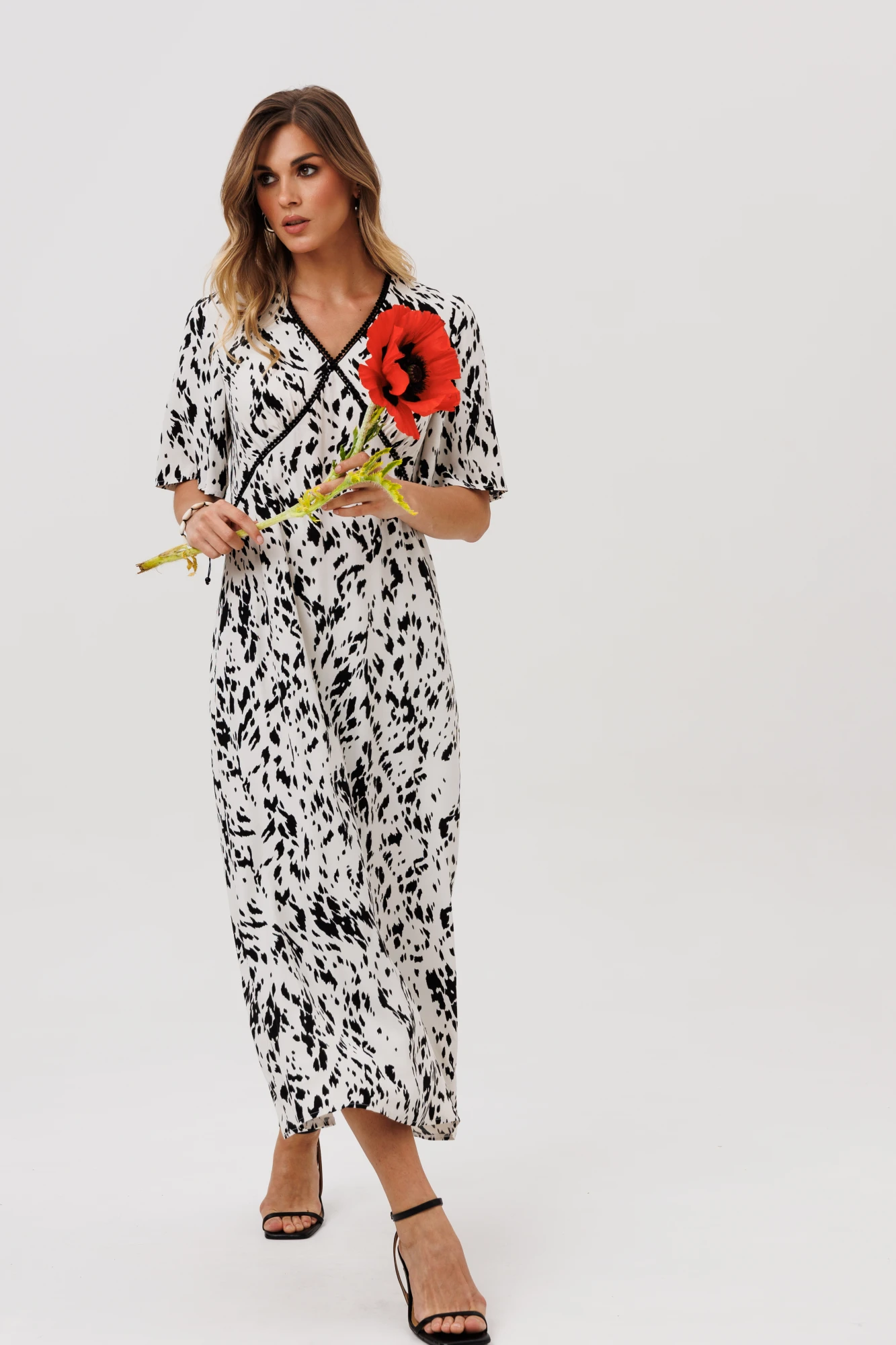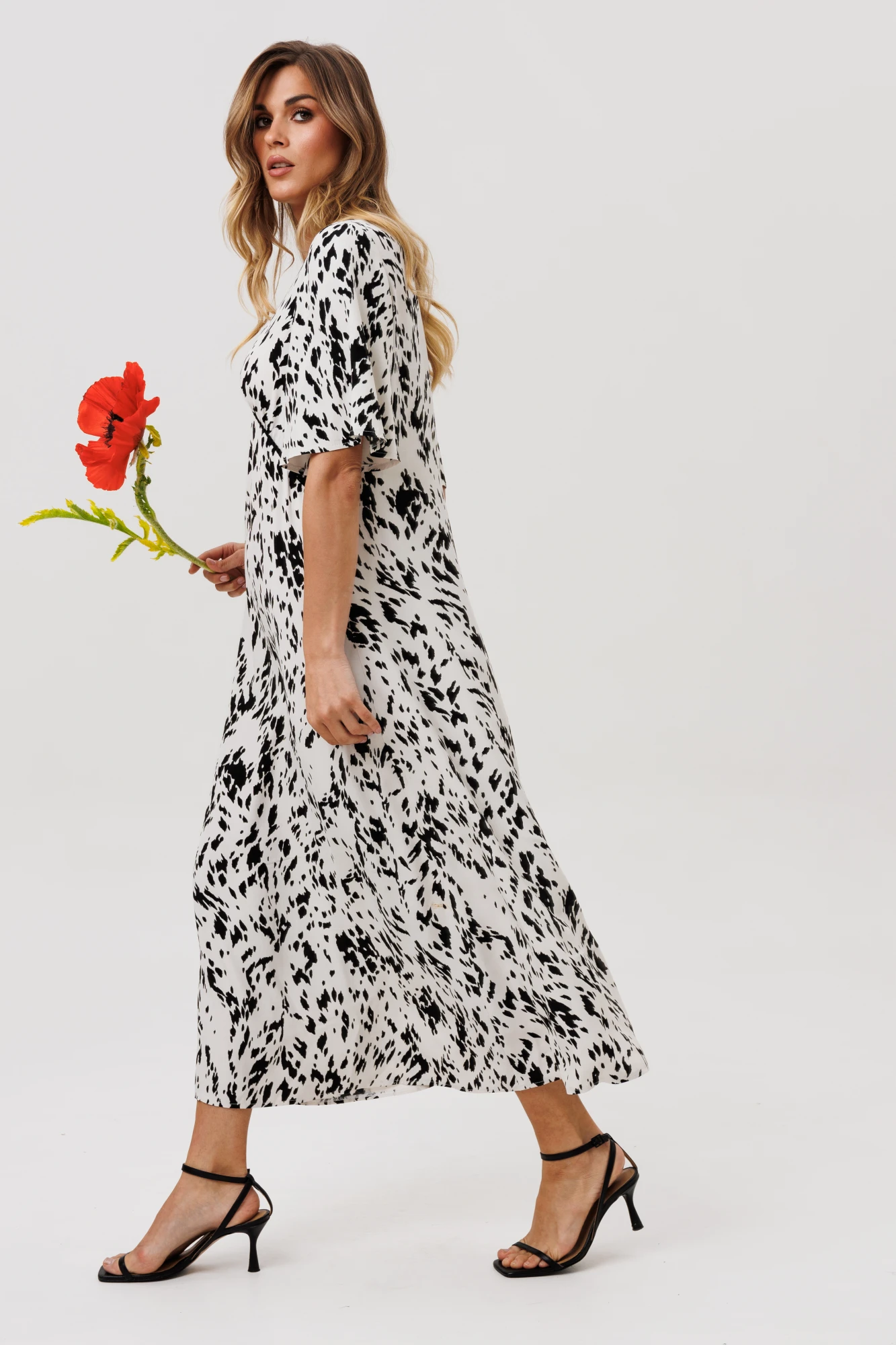 Платье А-образного силуэта выполнено из легкой вискозной ткани. Перед с V-образным вырезом и подрезами. В подрезах и вдоль горловины вставлено кружево. В районе груди в подрезах сборка. Рукав втачной расширенный книзу. Спинка со средним швом.