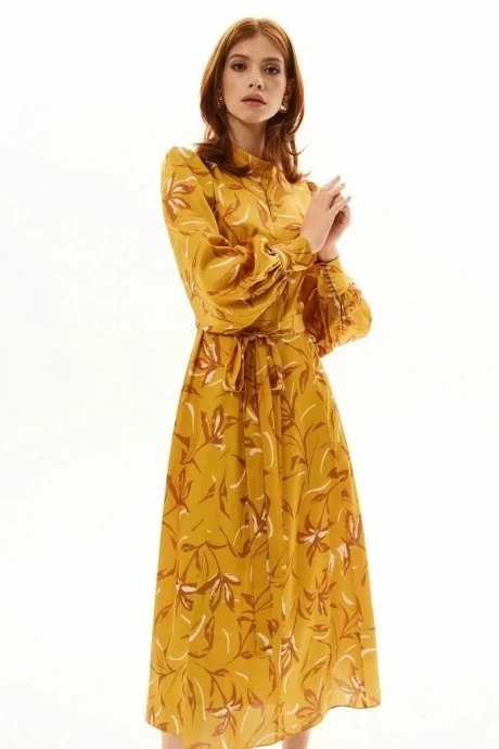 Описание внешнего вида: Платье с отрезной стойкой , застежкой на потайную молнию в среднем шве спинки, и на две навесные петли и пуговицы по стойке спинки. Платье отрезное по линии талии. Верхняя часть переда со средним швом, рельефами, выходящими из проймы. Нижняя часть переда и спинки состоит из четырех деталей. По окату и шву притачивания манжеты- сборка. Платье со съемным поясом.