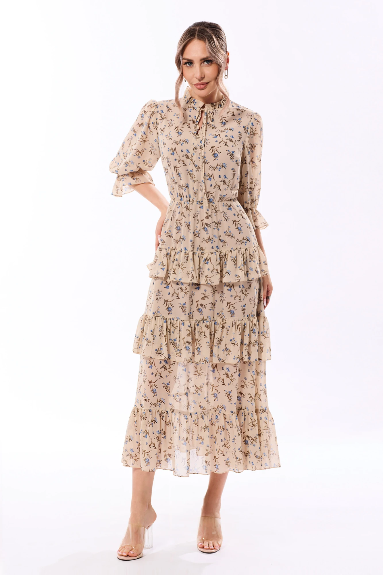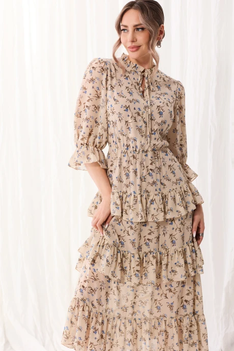 Платье без застёжки. Платье отрезное по линии талии. Верхняя часть переда с нагрудными вытачками. По горловине стойка- рюша с завязкой. Верхняя часть спинки со сборкой по шву притачивания стойки. Шов по талии присборен резинкой. Юбка с двумя сечениями, в которые вставлены присборенные рюши. Рукав втачной, длинный, присборенный на резинку. По окату рукава -сборка.