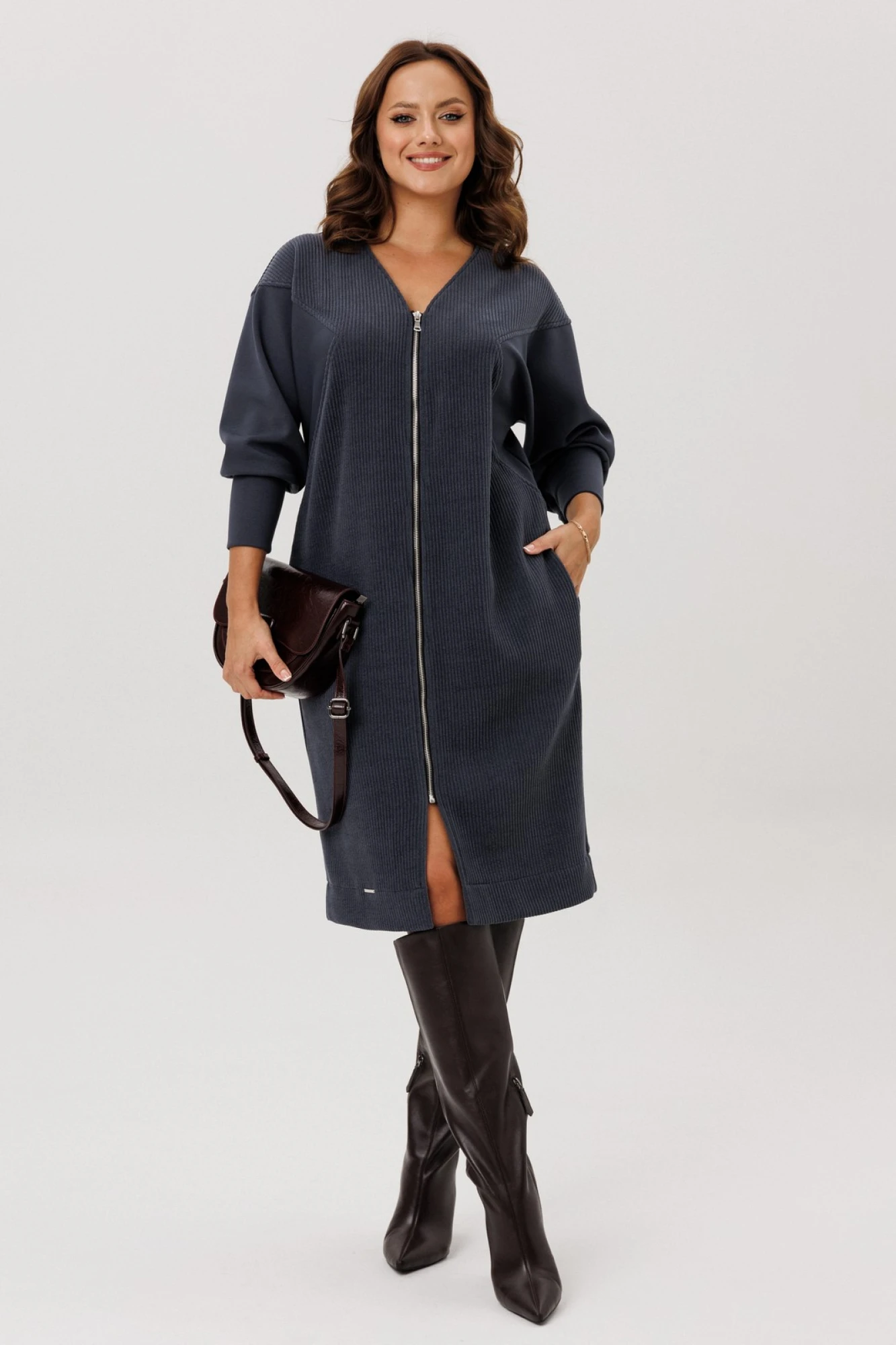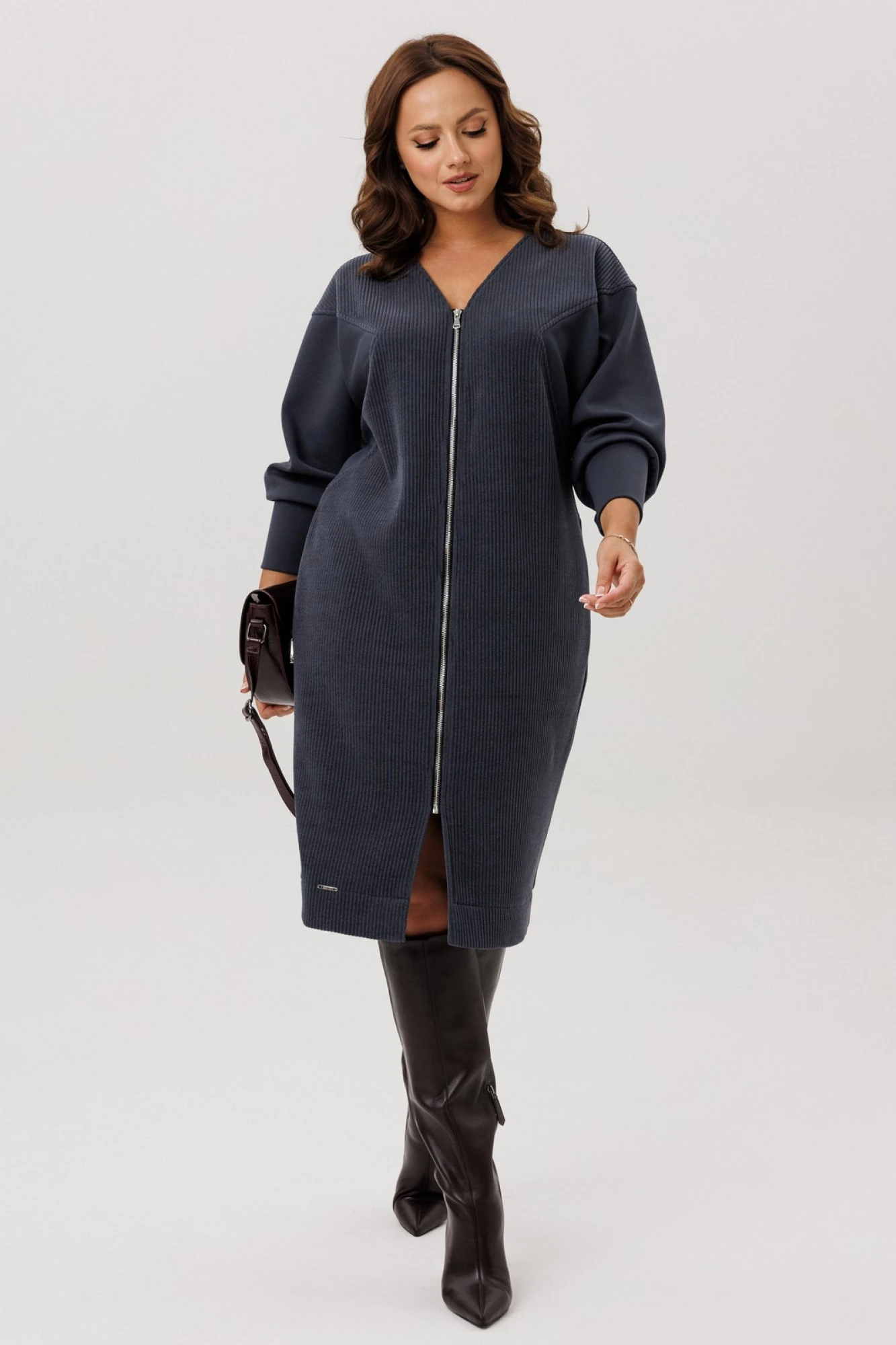 Платье полуприлегающего силуэта, вырез горловины V – образный, рукав цельнокроеный спущенный со вставками из кожи и на манжете внизу. По спинке кокетка, в боковых швах функциональные карманы. Застежка на тесьму-молнию. В комплекте ремень из экокожи.
