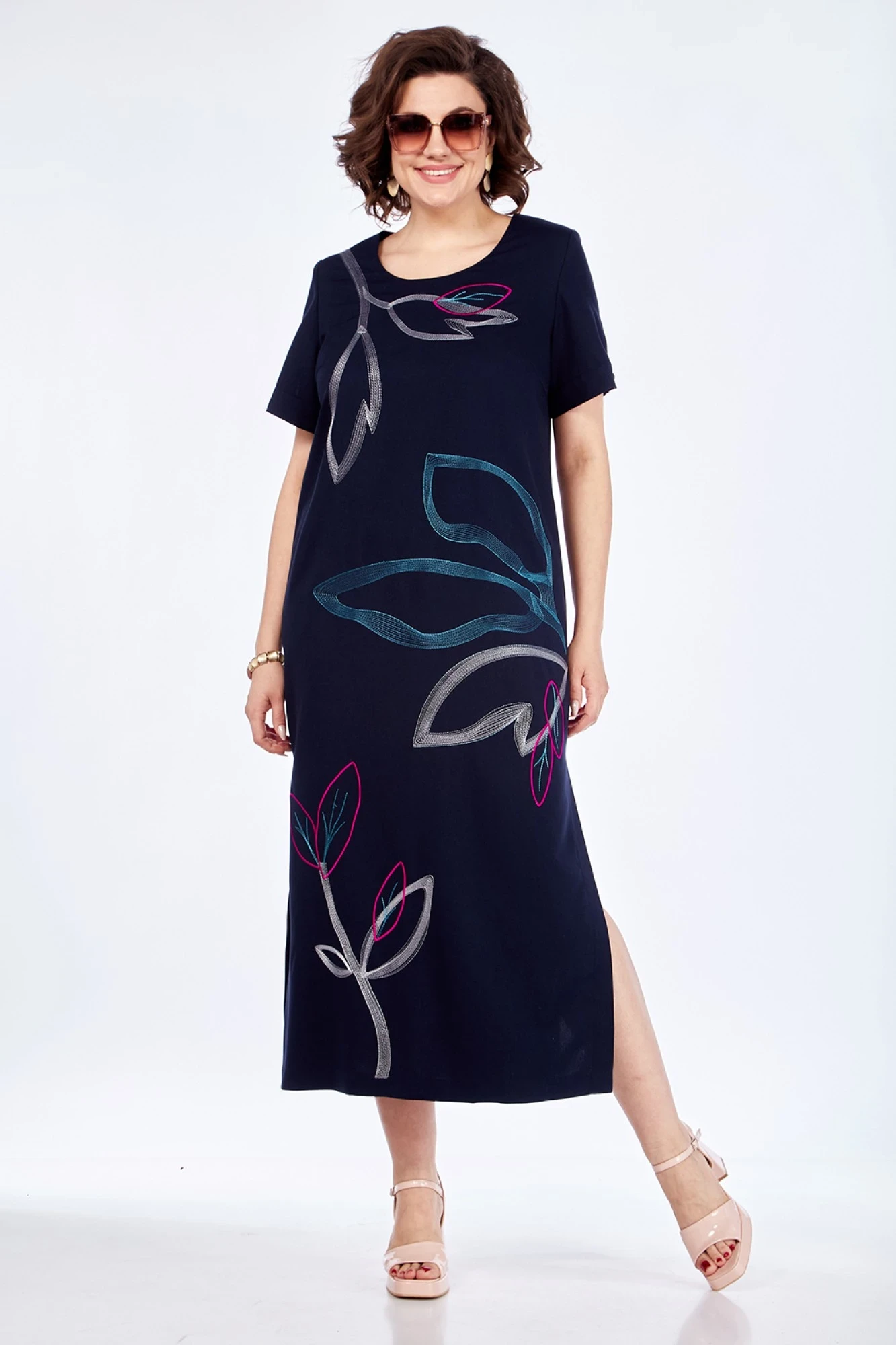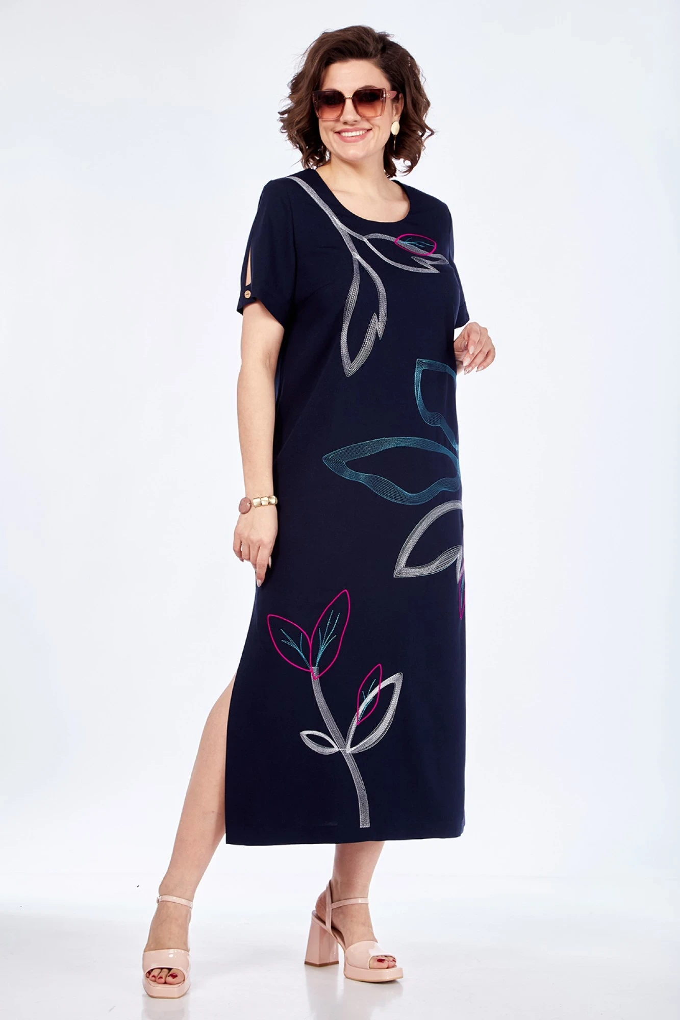 Платье женское прямого силуэта из плательной ткани. Горловина круглой формы. По переду нагрудные вытачки. На спинке средний шов. В боковых швах обработаны карманы, внизу разрезы. Рукава втачные, разрезные с фигурным вырезом. Платье декорировано дизайнерской вышивкой.