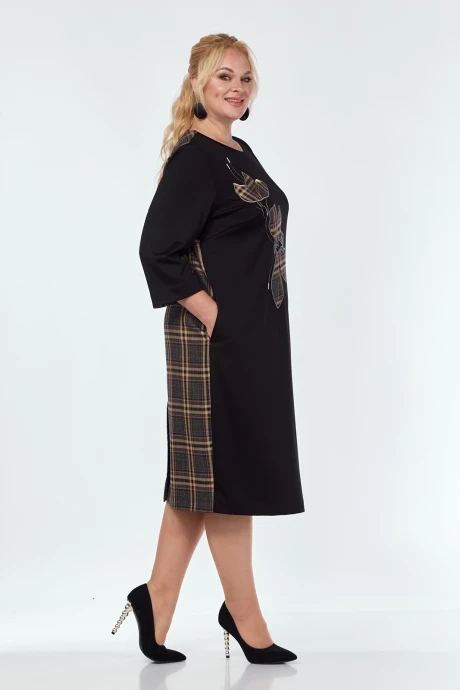 Платье женское повседневное выполнено, путем комбинирования ткани двух видов трикотажного полотна и из костюмно-плательной ткани в клеточку. Прямого силуэта. В боковых обработаны карманы. По переду дизайнерская вышивка. Рукава втачные длиной ⅞ с отложной манжетой из отделочной ткани.