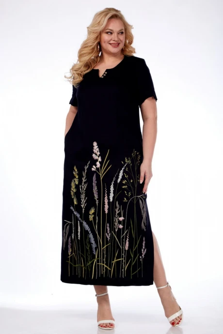 Платье женское прямого силуэта изготовлено из натуральной ткани. Горловина фигурной формы декорирована пуговицами. Перед с кокетками и нагрудными вытачками. Спинка цельная. По боковым швам обработаны карманы и разрезы. Рукав втачной, разрезной, с фигурным разрезом. Платье декорировано дизайнерской вышивкой.
