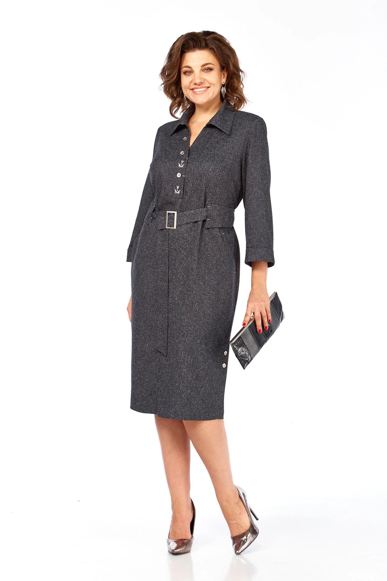 Платье женское прямого силуэта, изготовлено из плательной ткани. По переду нагрудные вытачки и фигурные подрезы с карманами в швах. Горловина оформлена планками с декоративной вышивкой и пуговицами, воротник стояче-отложной. На талии декоративные шлевки и съемный пояс с пряжкой. По спинке кокетка и средний шов. В боковых швах внизу обработаны шлицы декорированы пуговицами.