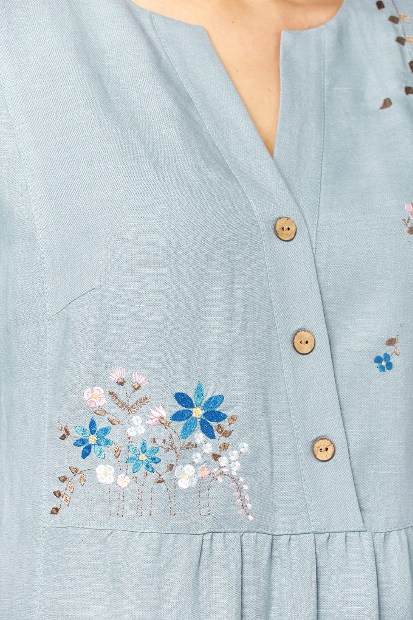 Платье женское, свободного силуэта выполнено из натуральной ткани. Горловина фигурной формы. Платье отрезное по линии талии и слегка присобрано. В верхней части переда обработана имитация застежки на запах. Линия плеча слегка спущена. Рукава с отложными манжетами. В боковых швах обработаны карманы. Изделие дополнено дизайнерской вышивкой.