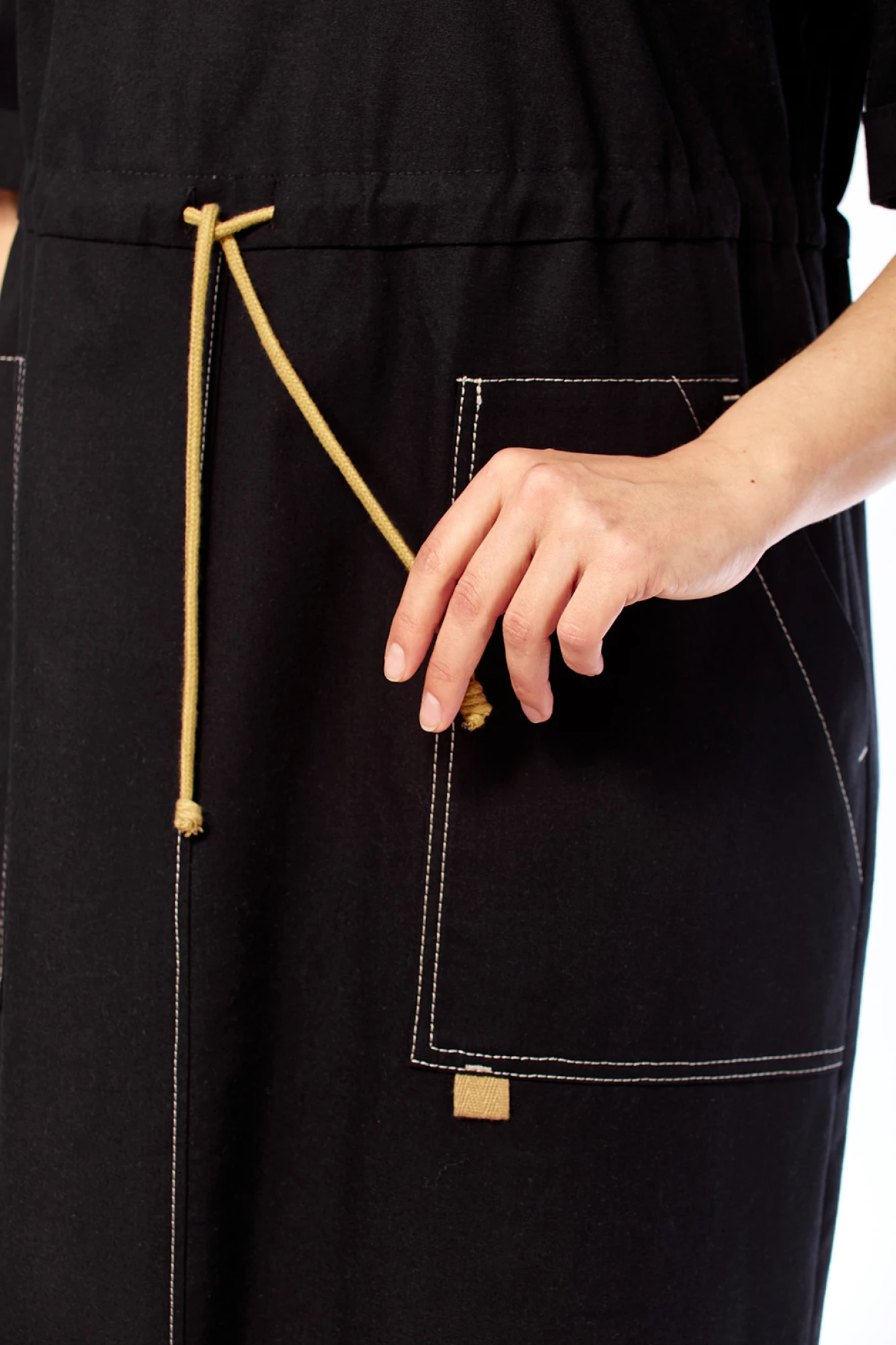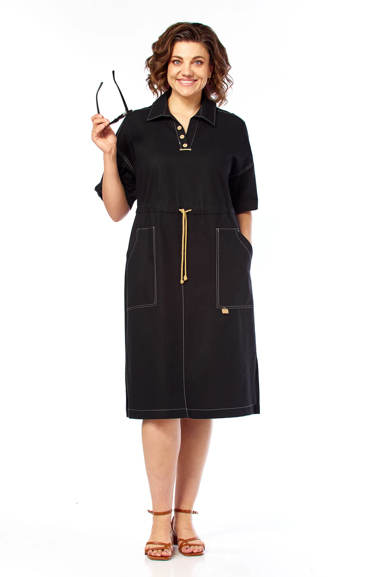 Платье женское, прямого силуэта из плательной ткани. Горловина оформлена воротником и планками, декорированными пуговицами. Платье отрезное по талии с кулисой. Обработаны накладные карманы. Рукав спущенный с отложной манжетой. По спинке кокетка, переходящая на перед. На юбке платья средний шов. В боковых швах разрезы. Платье декорировано отделочной тесьмой и шнуром в цвет тесьмы.