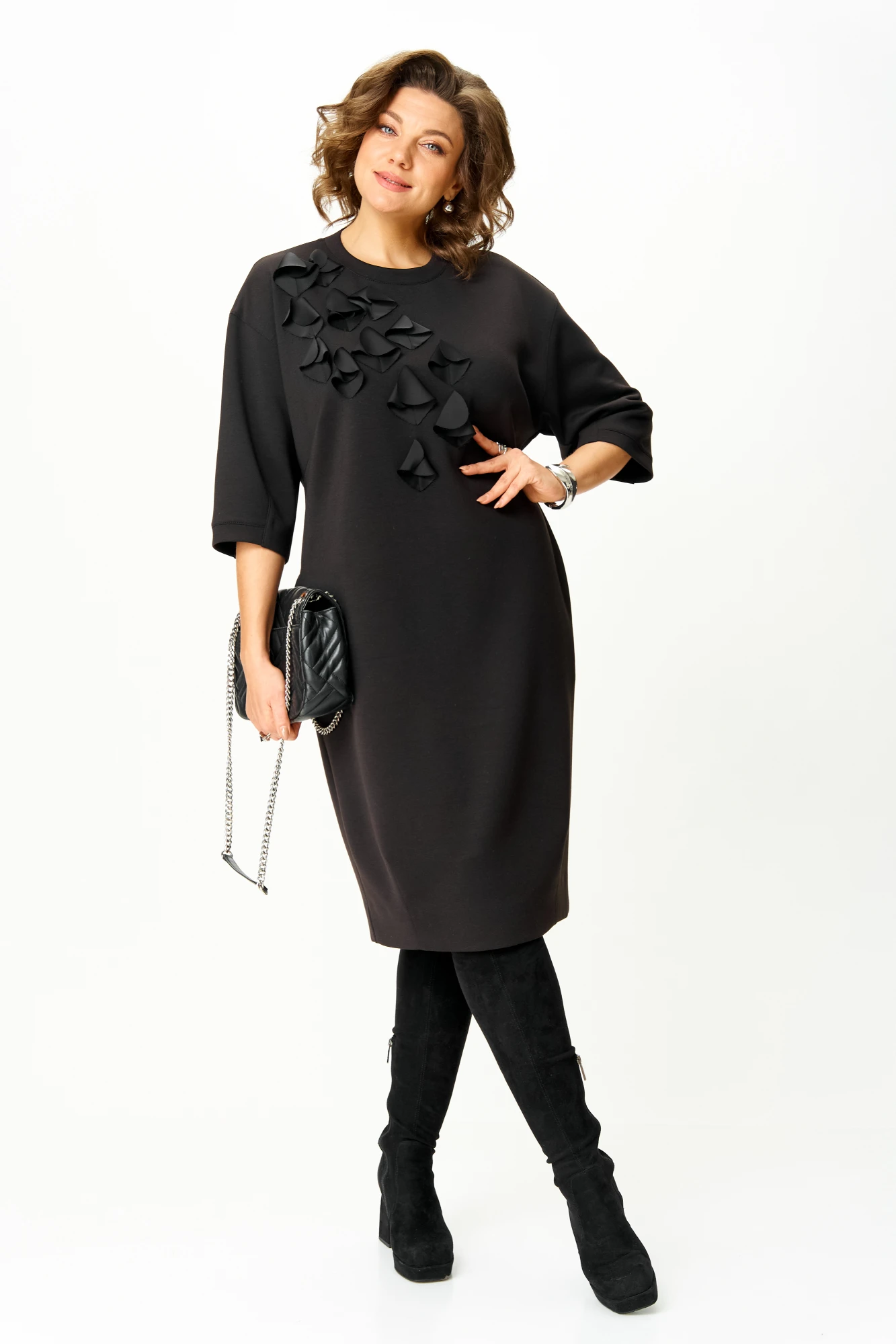 Платье выполнено из высококачественного гладкого трикотажного полотна с декоративной аппликацией из сатина в тон основной ткани. Силуэт прямой, к низу слегка зауженно; линия плеча спущена. Горловина овальная, обработана декоративной бейкой. По переду настроена аппликация в виде лепестков. Карманы в боковых швах. Рукав длиной 3/4, прямой , низ обработан бейкой. Спинка со средним швом. Платье без застёжки, без подкладки.