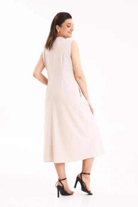 •Платье А-образного силуэта длиной миди. Линия плеча слегка спущена, по переду идут диагональные подрезы с вставкой из косой бейки из основной ткани. Спинка слегка приталенна вытачками. Застёжка на потайную молнию сзади