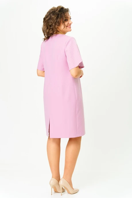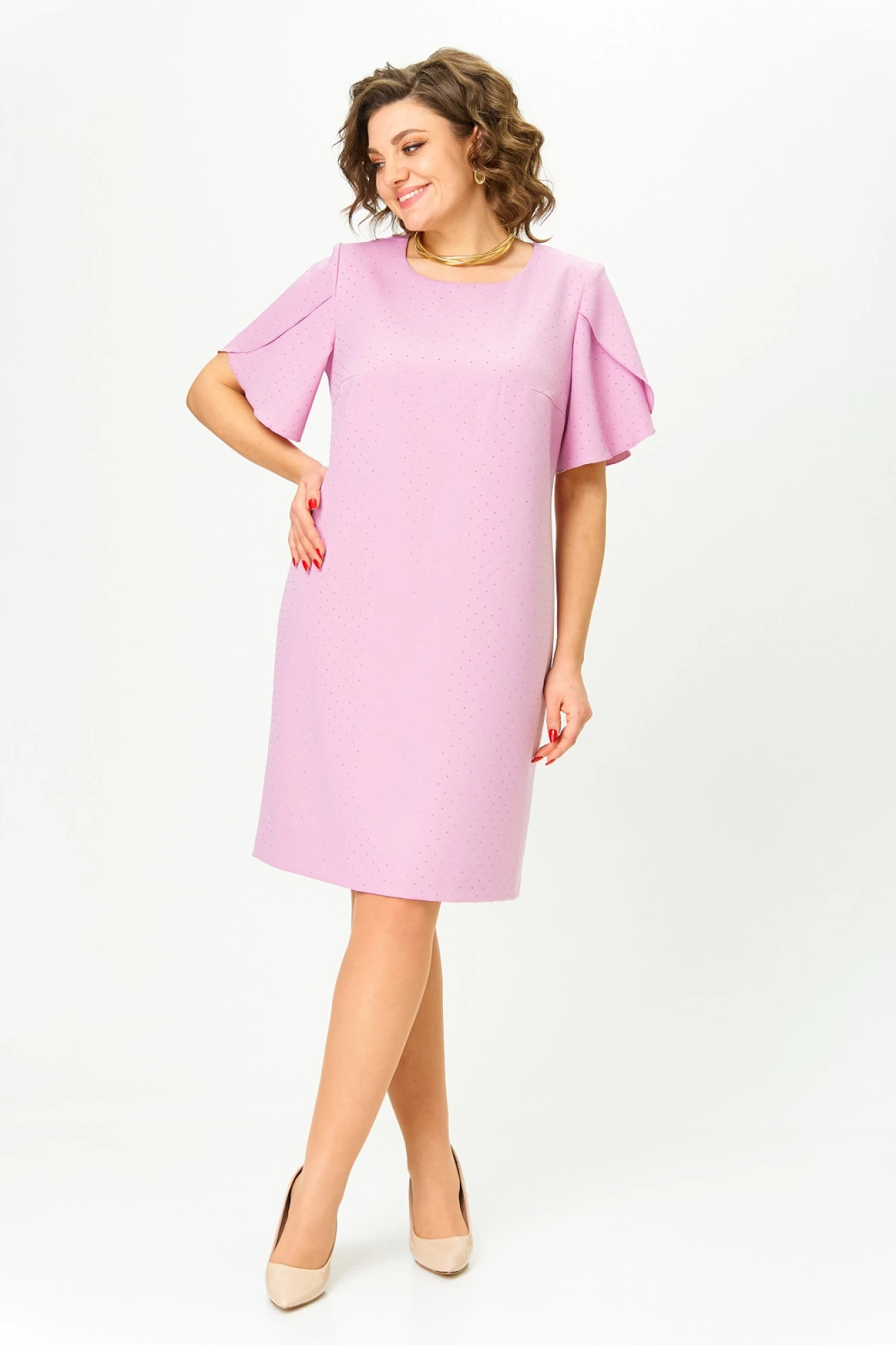 Нарядное женское платье из облегченной плательной ткани со стразами в цвет, полуприлегающего силуэта, длиной чуть ниже колена. Вырез горловины круглый. По спинке центральный шов с застежкой на потайную молнию и небольшим разрезом внизу. Элегантность модели придает оригинальный фигурный втачной рукав.