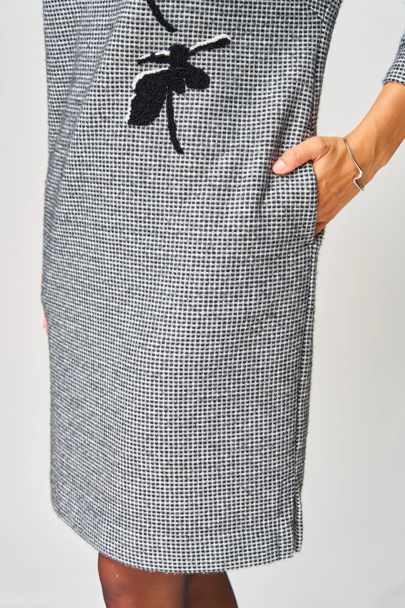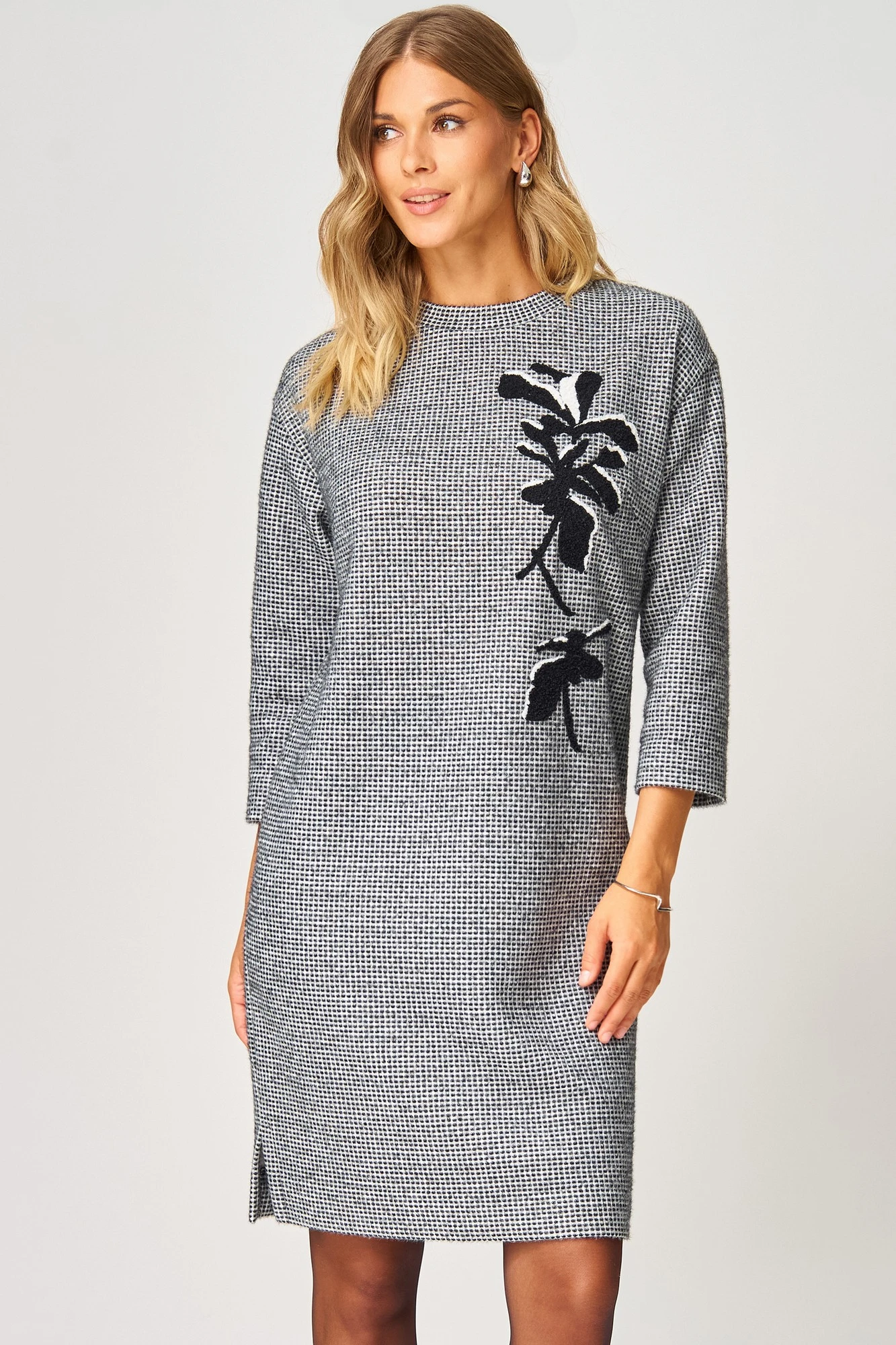 Вырез горловины округлой формы с втачной бейкой. Деталь переда с нагрудными вытачками, вверху нанесена аппликация-вышивка. Спинка цельная. Рукава втачные одношовные, длиной 3/4, линия плеча спущена. В боковых швах обработаны карманы и разрезы.