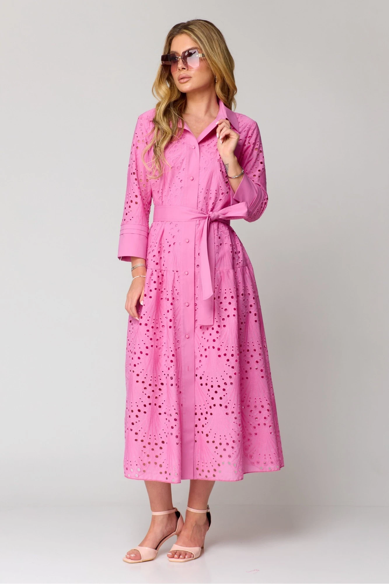 Платье женское, повседневное, на подкладке, полуприлегающего силуэта, с втачными рукавами, длиной ниже линии колена, с втачным воротником, отрезное ниже уровня линии талии, со съемным поясом, с центральной застежкой на 9 петель и 9 пуговиц и 1 петлю и пуговицу на стойке. Деталь переда платья с притачными планками. Лиф переда с нагрудными вытачками. Деталь спинки платья с кокеткой. По шву соединения лифа с юбкой обработана сборка. Рукава втачные одношовные, длиной 3/4, с притачными широкими манжетами. Манжеты с разрезами, с 2-мя складками. Воротник сорочечный с отрезной стойкой.Длина спинки – 121см.
