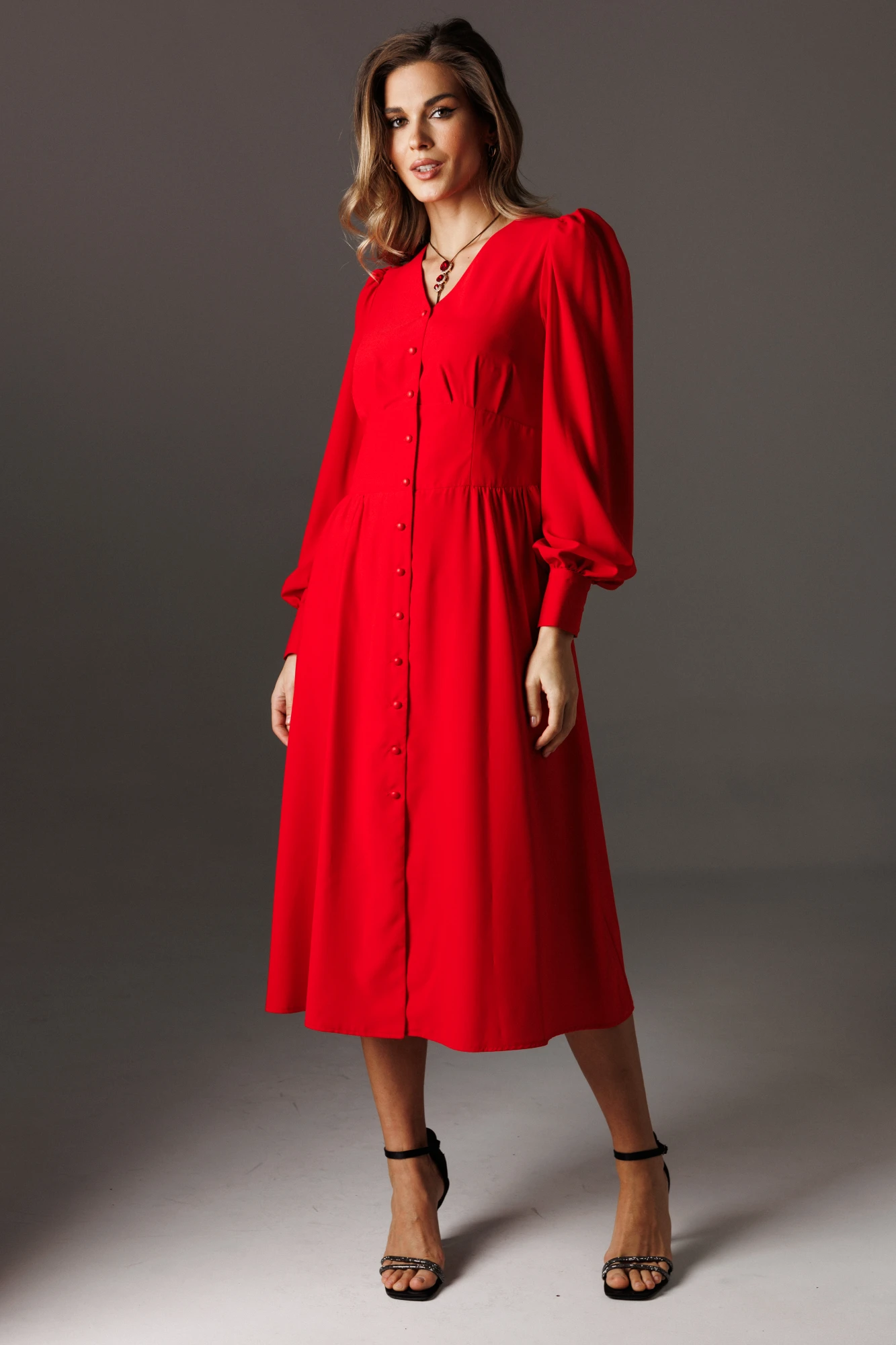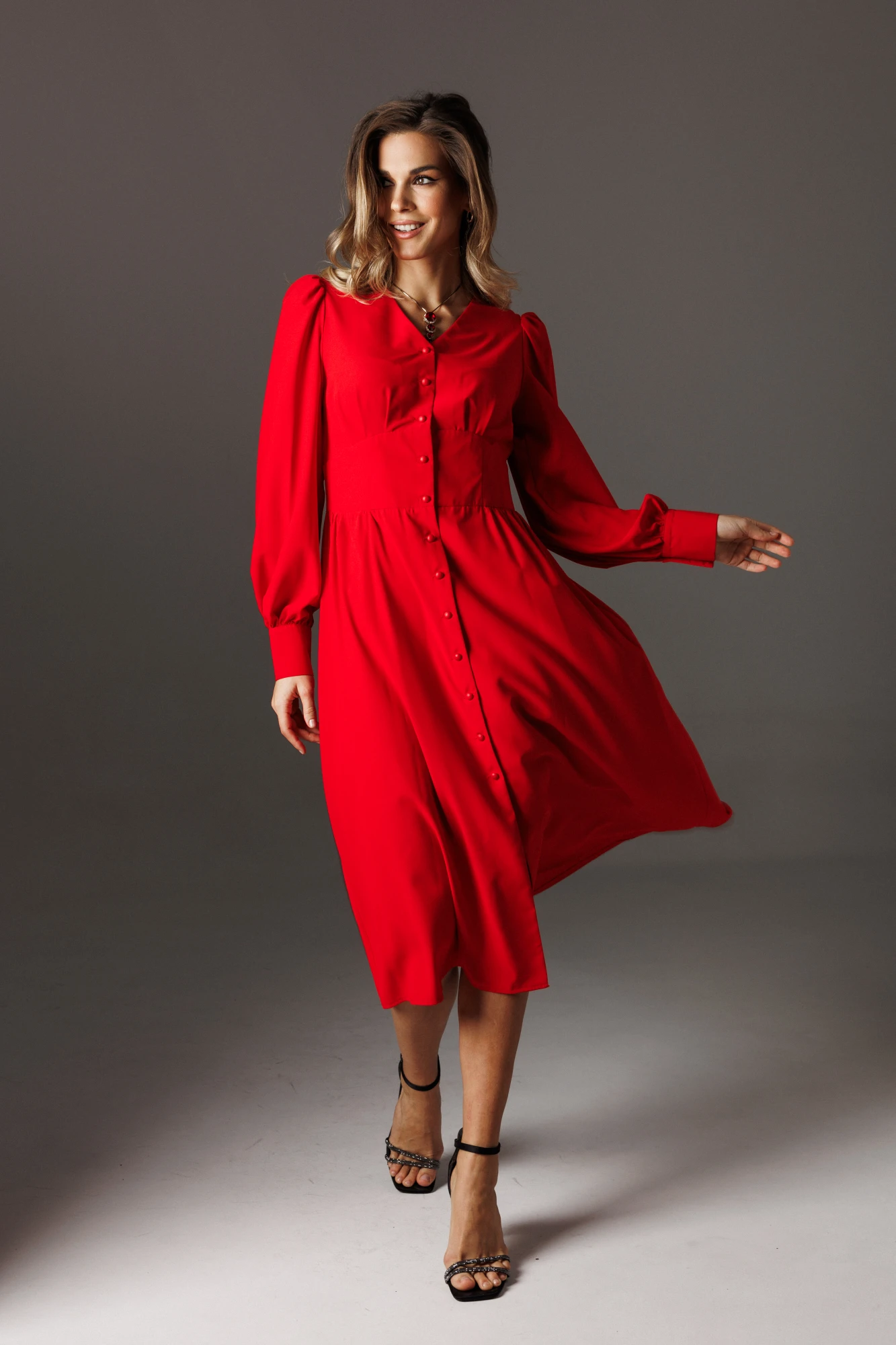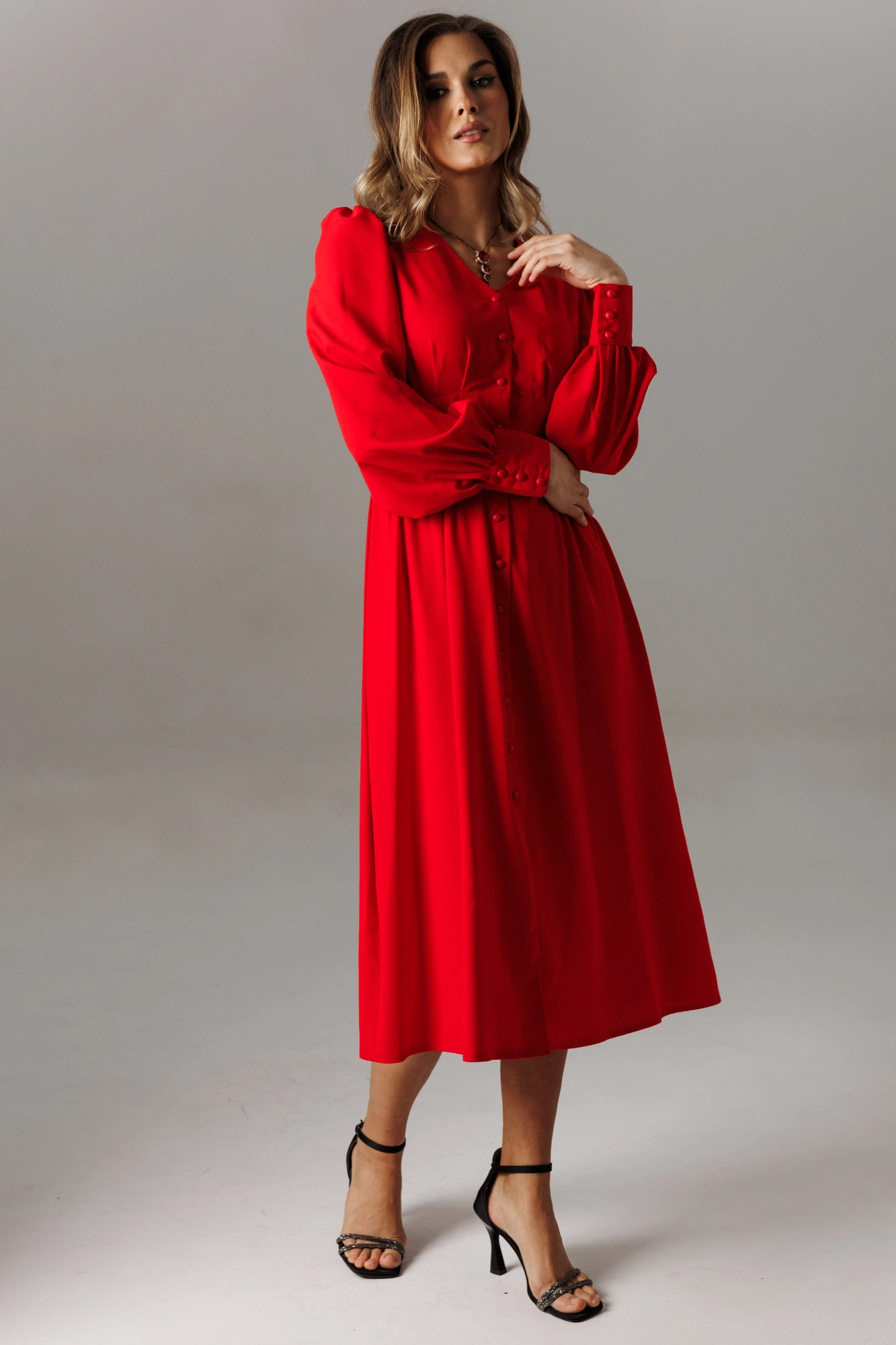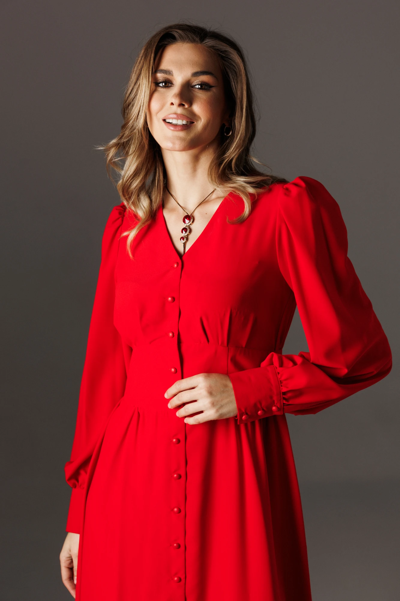Воздушное элегантное платье. Изделие состоит из отрезного лифа, спереди со складками по линии груди, по спинке - сборка. Юбка изделия имеет расклешение к низу, по талии фрагментами сборка. Лиф и юбку соединяют облегающие рельефные детали, имитирующие фигурный корсет, высотой от 7,5-12 см. Спереди платье на застежке: петли-пуговицы. Горловина имеет V-образный вырез. Рукав втачной, одношовный, с притачной манжетой. Длина рукава в готовом виде 65,5 см. По окату и низу рукава: сборка. Спереди платье имеет застежку на петли-пуговицы. Длина платья по спинке 112-115 см (согласно размерному ряду). Платье на трикотажной подкладке (лиф платья и юбка).
